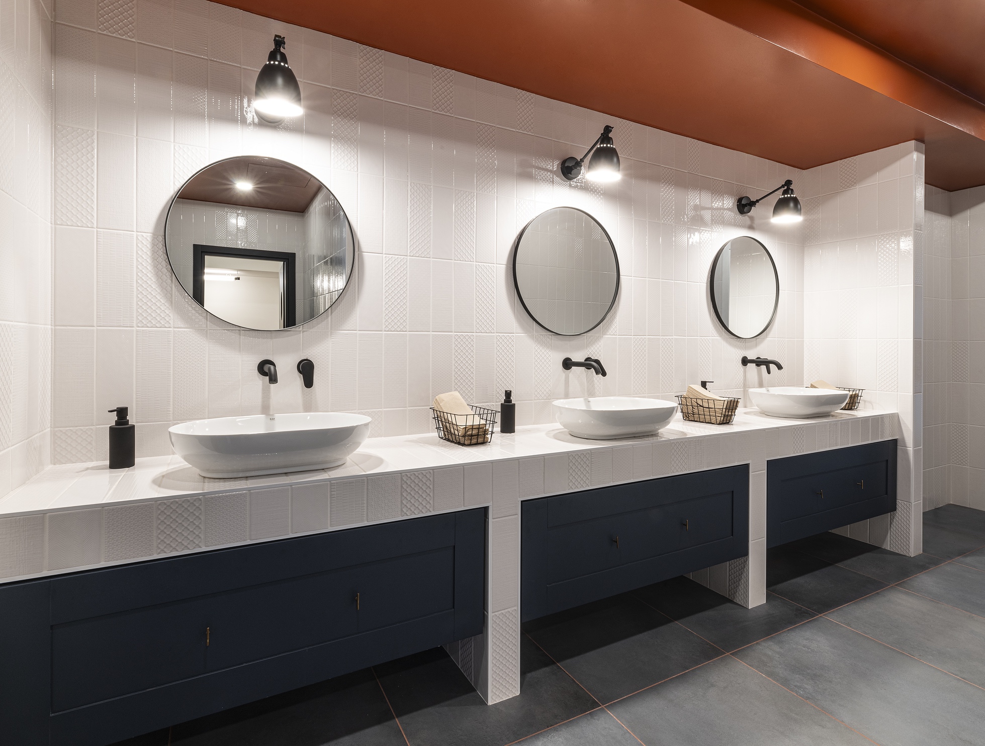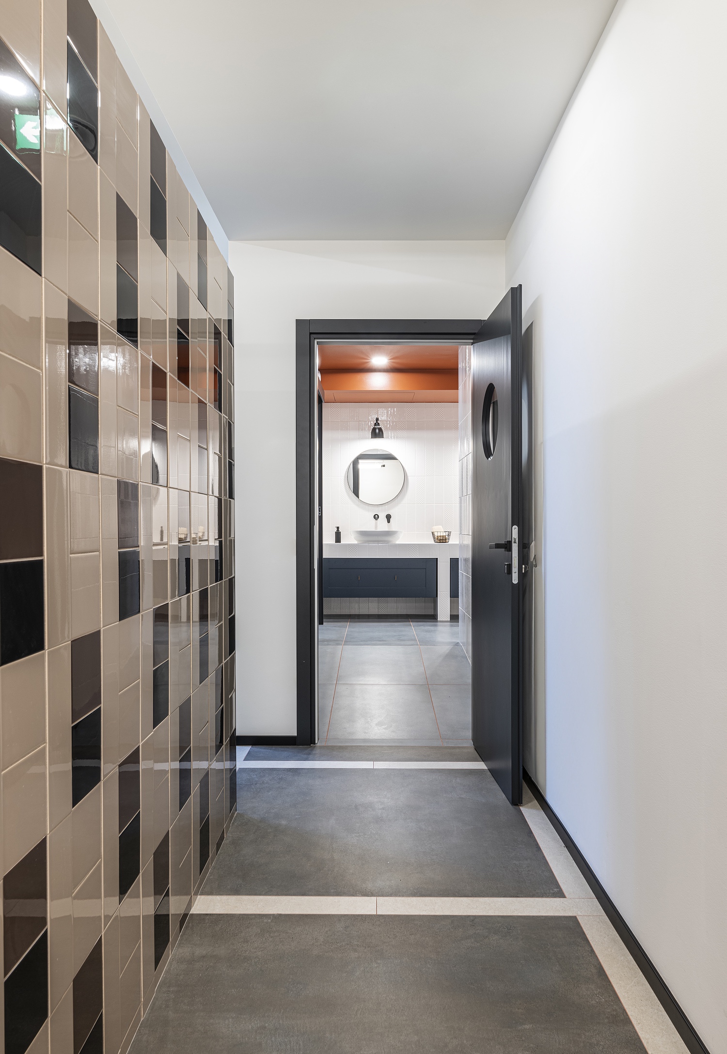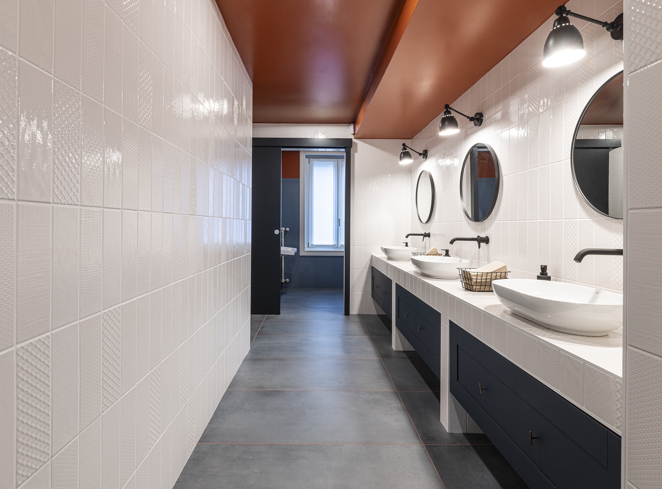 The choice of colors and finishes was driven by the desire to create a contemporary and captivating work environment. For the office floors, the Burnt Umber color from the Fresco collection and the Sand color from the Ease/22 collection by Ricchetti were selected. For the bathroom, it was chosen the Blue Whale color from the Fresco collection. All the floorings feature orange-colored grout, adding originality and a captivating, innovative style. For the wall coverings, small formats from Cinca were chosen, covering both the corridor walls with the Arquitectos series (in Taupe, Mocha, and Preto colors) and the bathroom walls with the Mix&Match New York series (in White Glossy color). The goal was to create an environment that inspires creativity and productivity while maintaining timeless elegance.