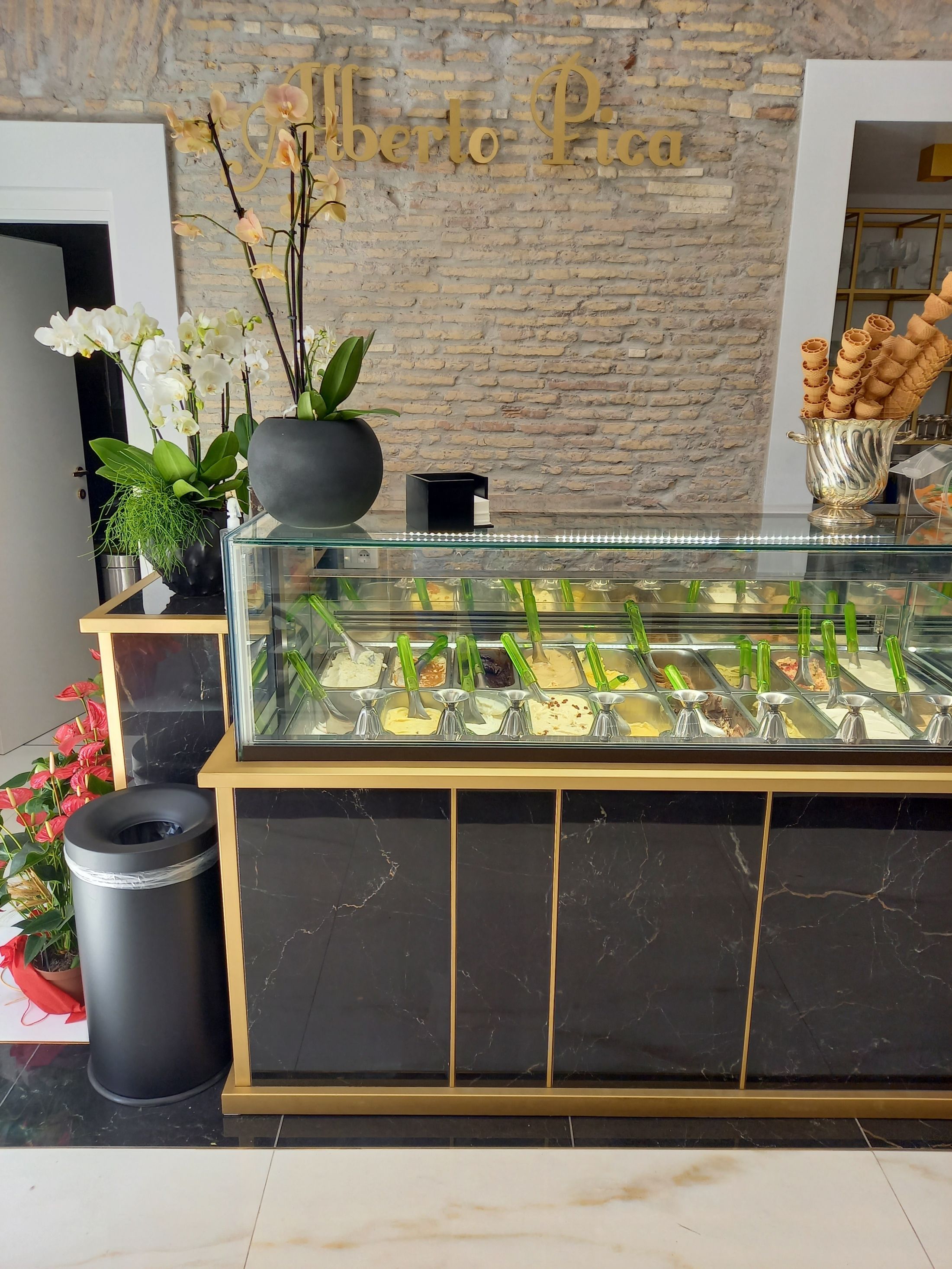 A café and ice cream shop in Rome enhanced by the marble-effect porcelain stoneware from the Golden Pure collection by Ricchetti.