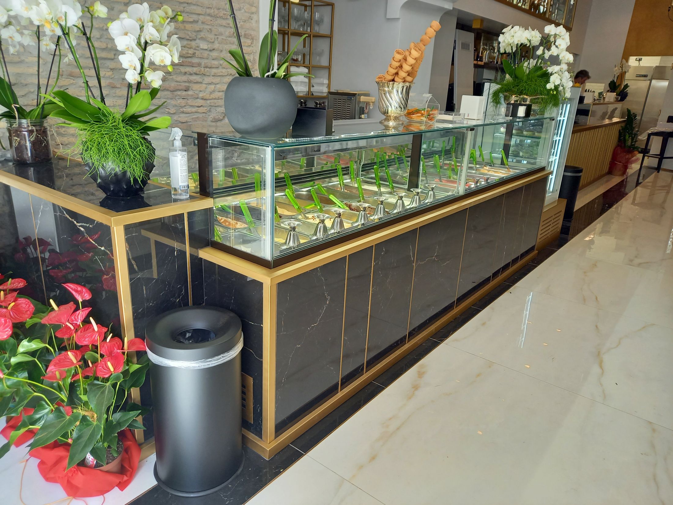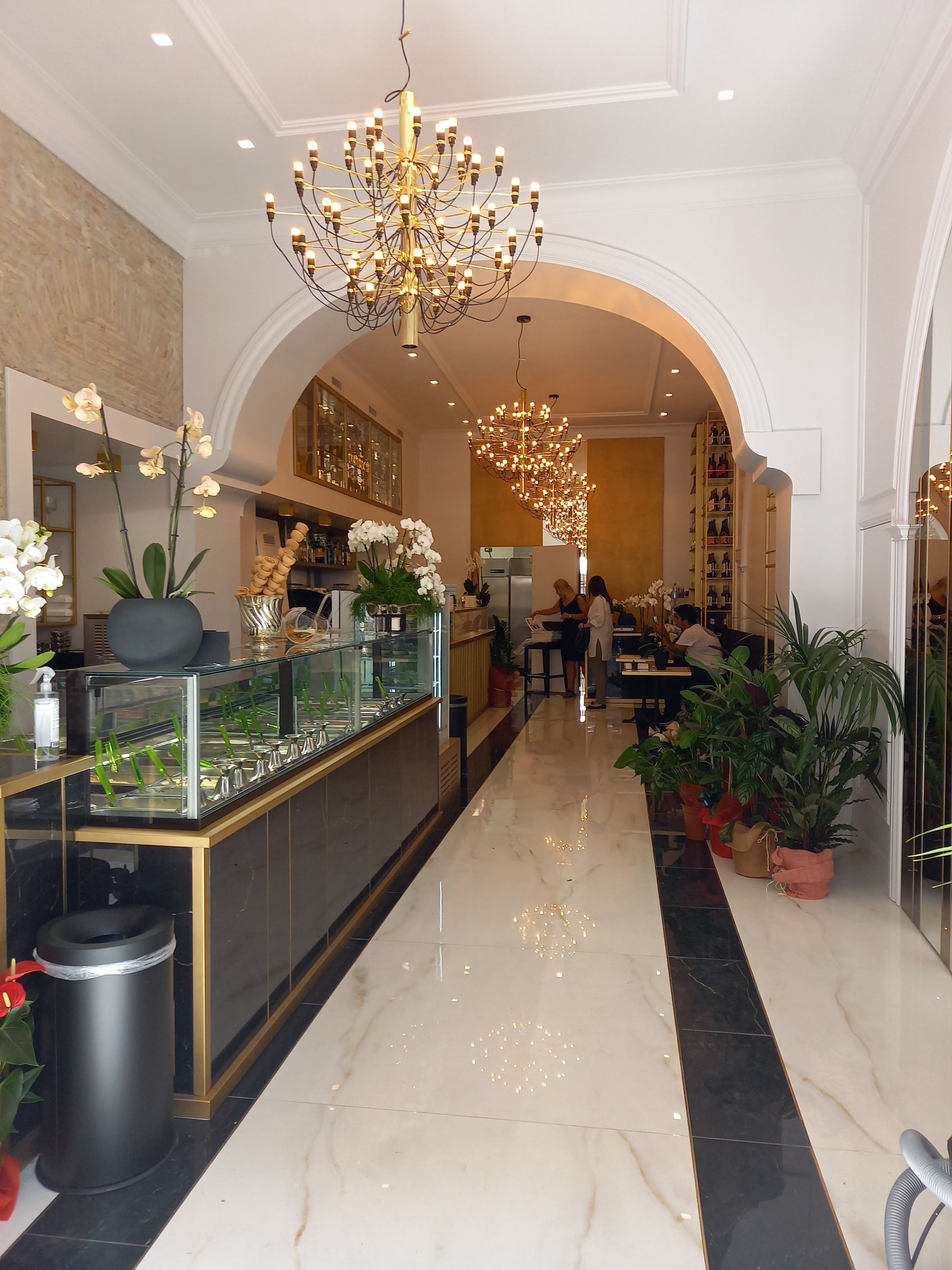 In the heart of Rome, a café and ice cream shop transforms into a style manifesto thanks to the surfaces from the Golden Pure collection by Ricchetti. The stars of the project are Saint Laurent and Covelano Vena Oro, chosen for their golden veining, accentuated by the lux finish, a mirror-polished treatment that enhances the depth and brightness of the material.