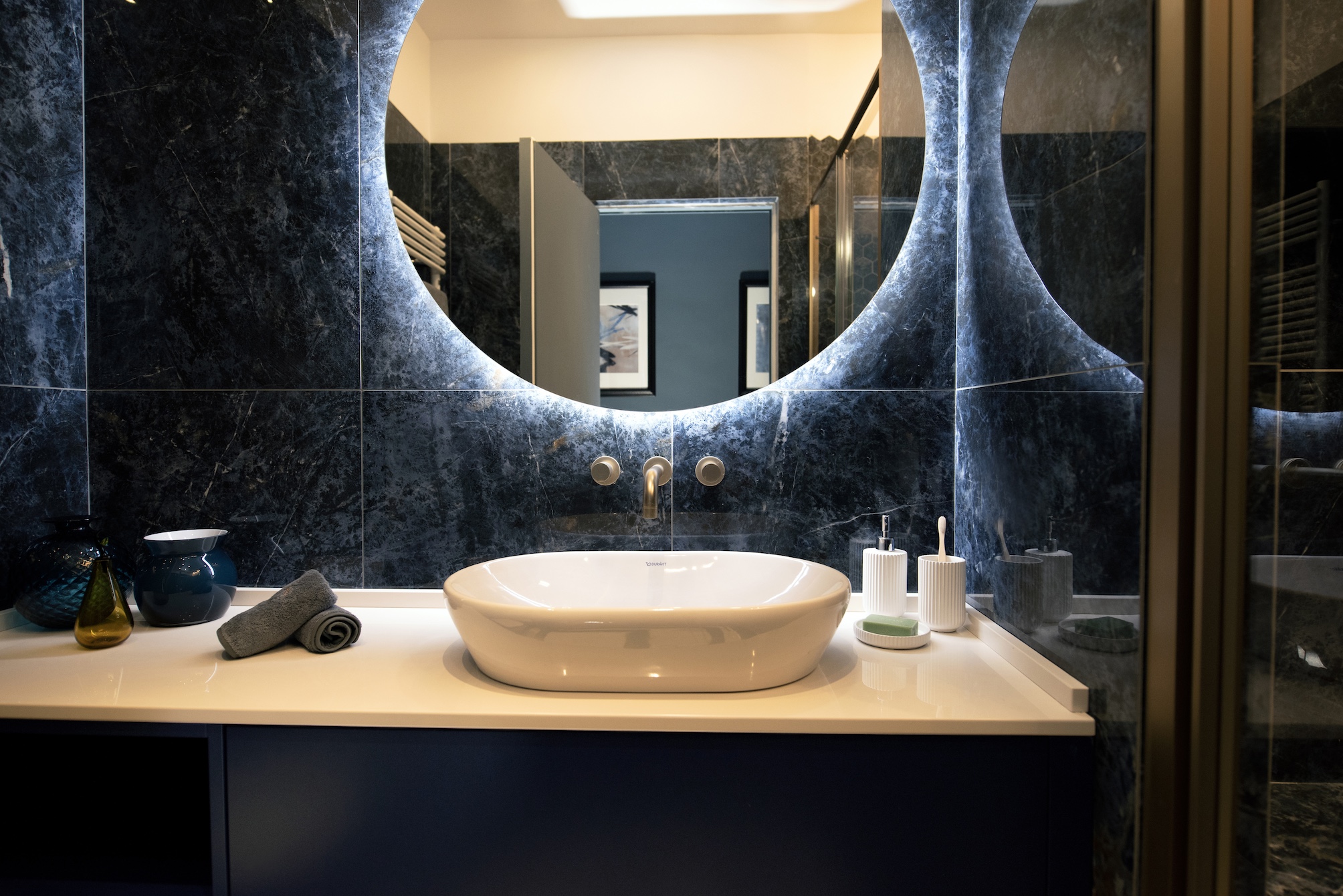 In the main bathroom, the use of Sodalite-coloured porcelain stoneware illuminated by soft, direct lighting on the wall tiles further accentuates the beauty of this shade, creating an enveloping and luxurious atmosphere.