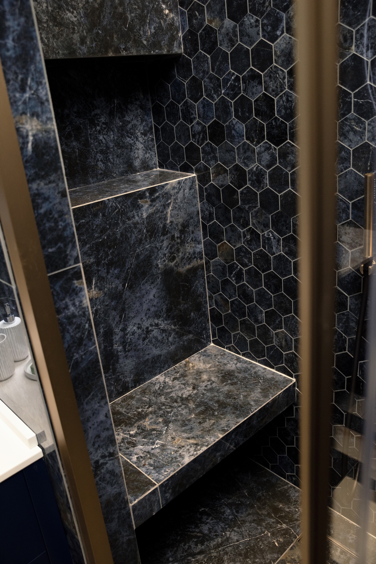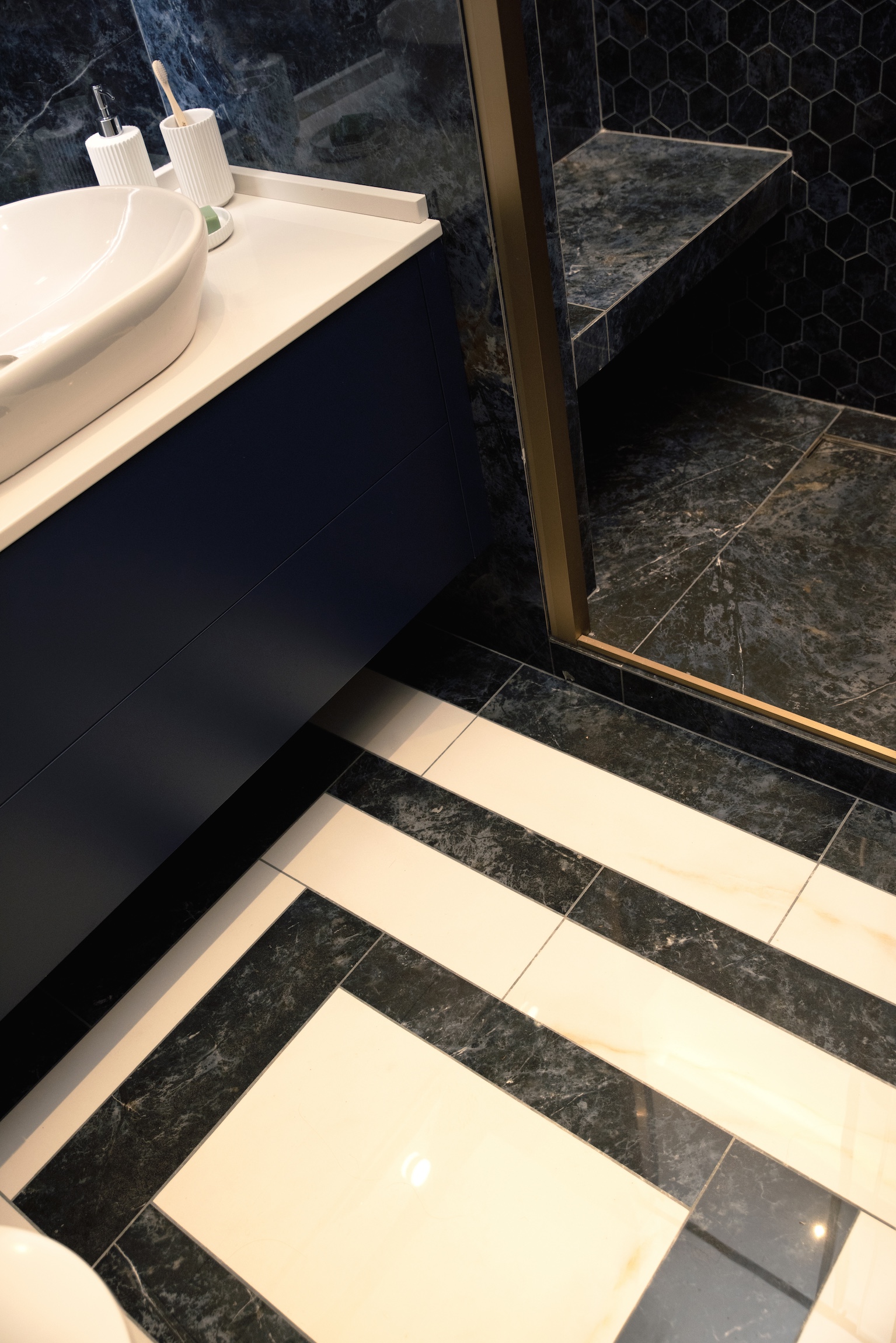 The Covelano Vena Oro and Sodalite coloured stoneware used for the floor add a touch of sophistication to the room, emphasising the opulence of the interior.