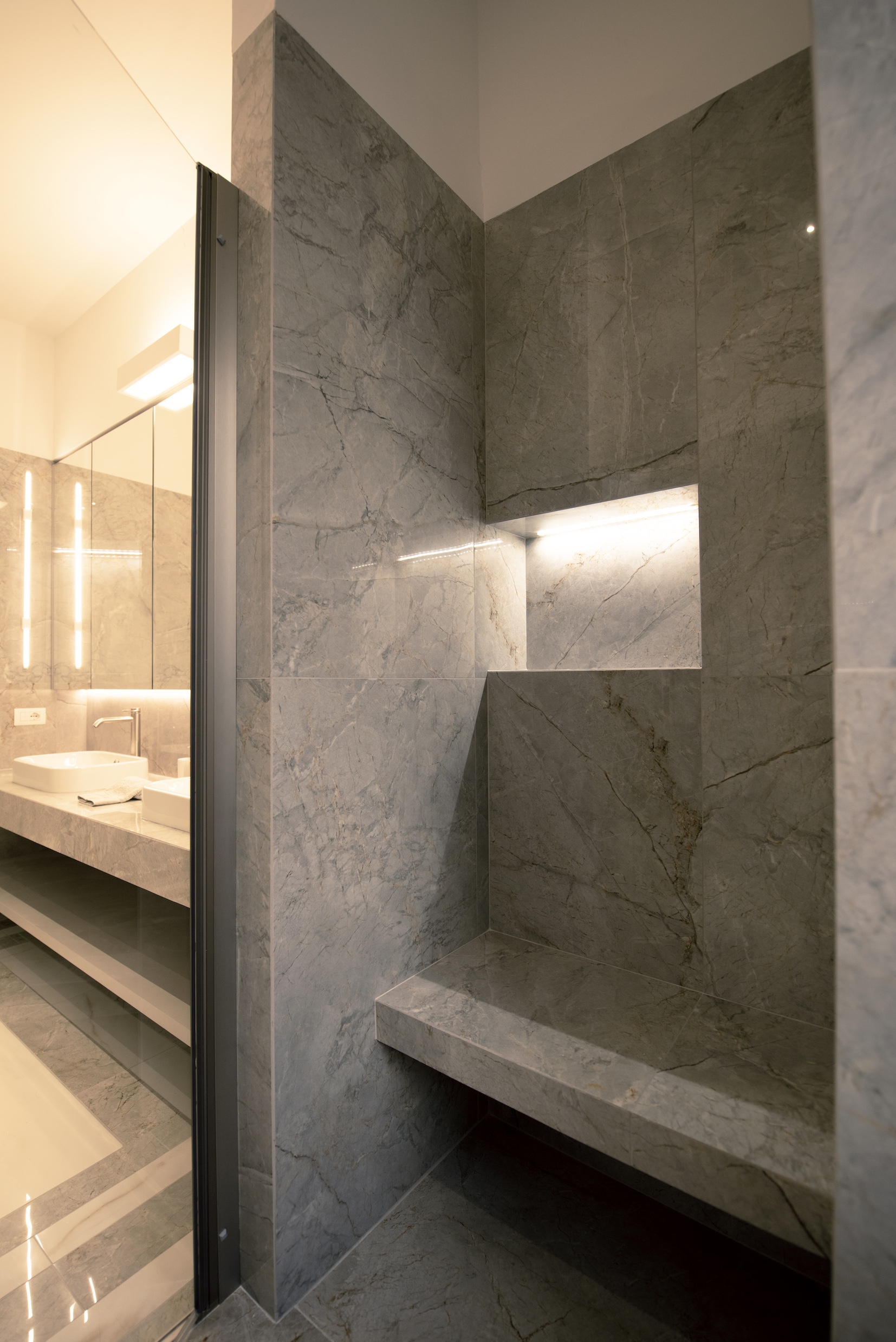 Thanks to the skilful use of porcelain stoneware from Ricchetti's Golden Pure collection, this space has been transformed into an environment of exclusive contemporary luxury.