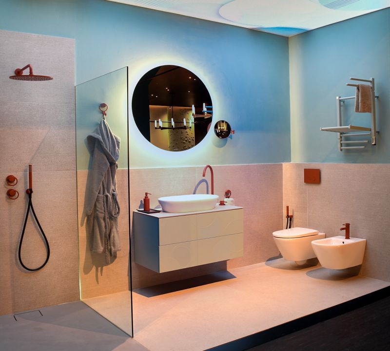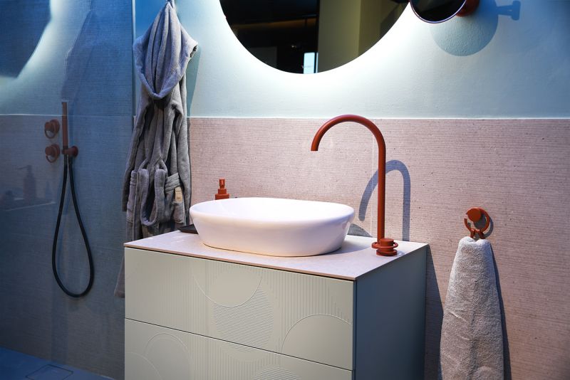 Ricchetti's natural flair for interior design was emphasised in Andrea Castrignano’s showroom at Via Adige 11 through the use of Ease/22 shades for bathroom furnishings: the durability and practicality of ceramics become a tool for the creation of walls, floors and furnishing surfaces in an ensemble where the mix of colours takes centre stage, in keeping with Castrignano’s mood.