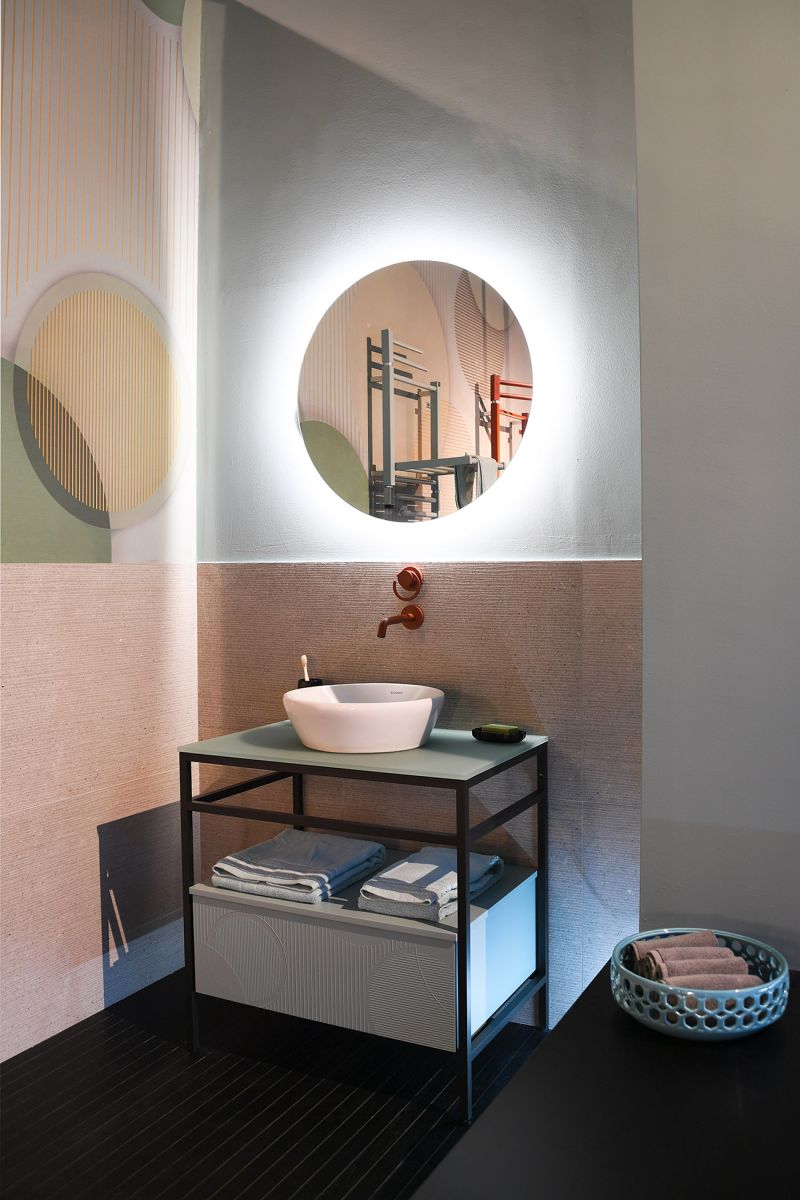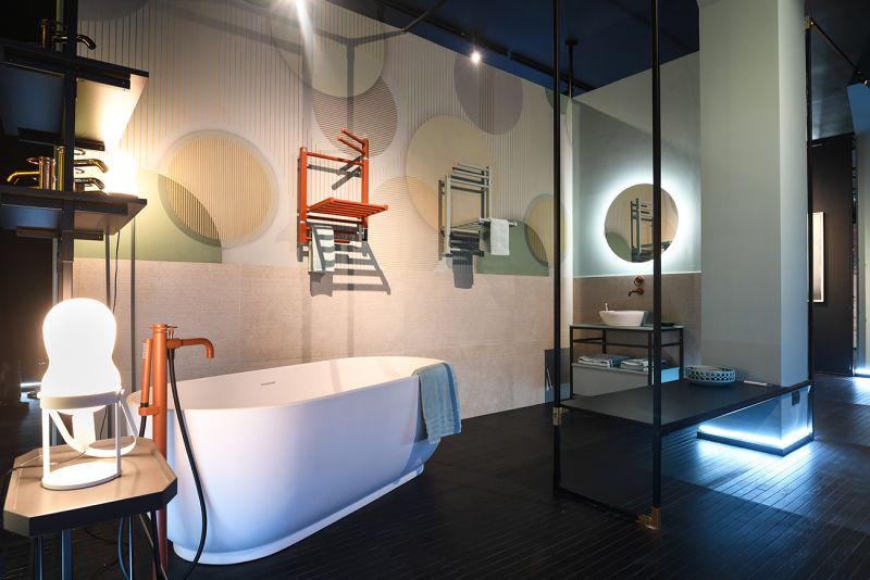 And finally we come to the church of San Marco in Brera, which provided space for dOT (Design Outdoor Taste) to stage three exhibitions with different content: the exhibition in the large cloister, in which GCR Project engaged with companies from the world of interior design and contract; the cloister portico, which became a tunnel of interior architecture, a pathway between customised furnishings, innovative lighting systems and new-generation materials, paved with Ease/22, a series also used to cover the walls of the entrance area; the part adjacent to the cloister, on the other hand, was dedicated to bathroom furnishings.
