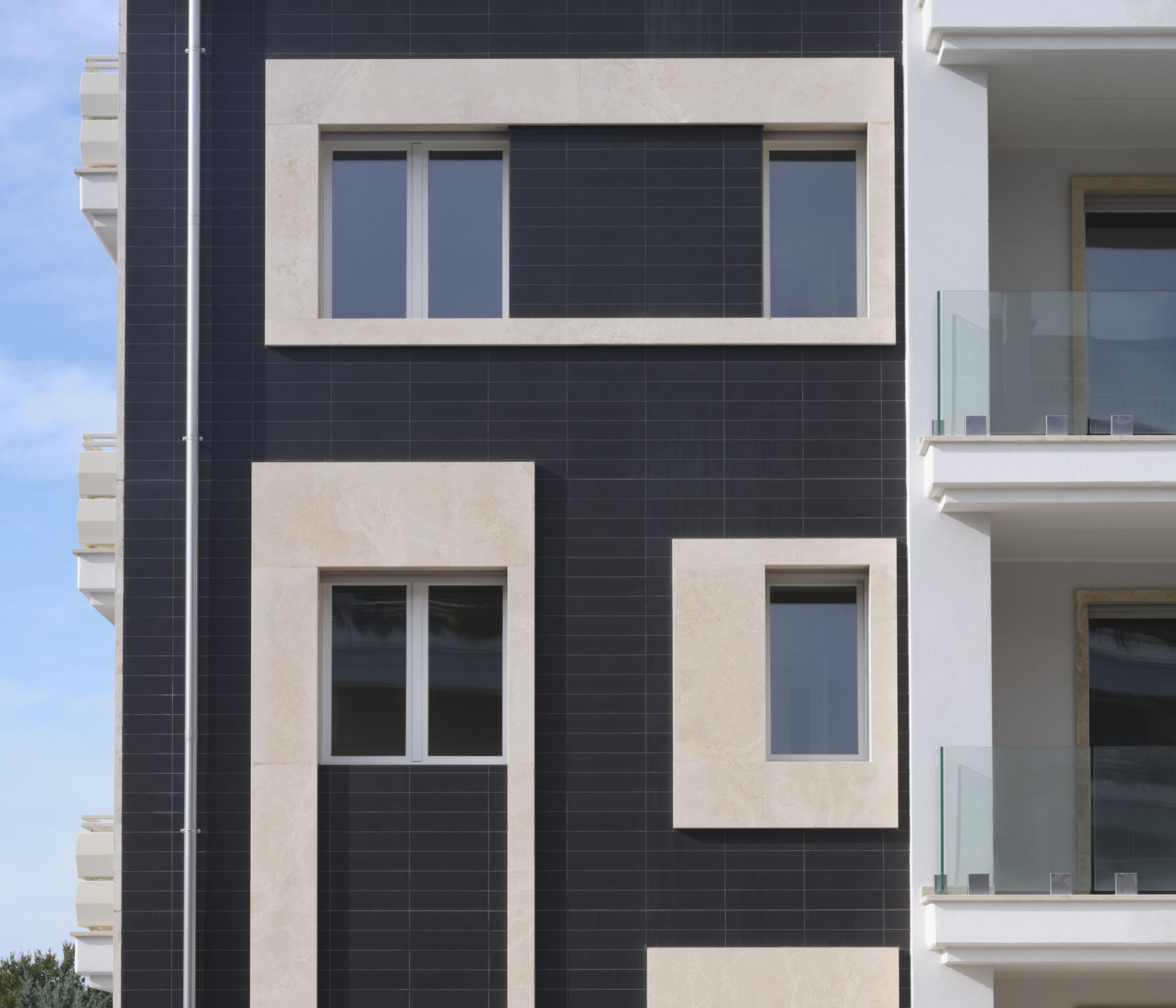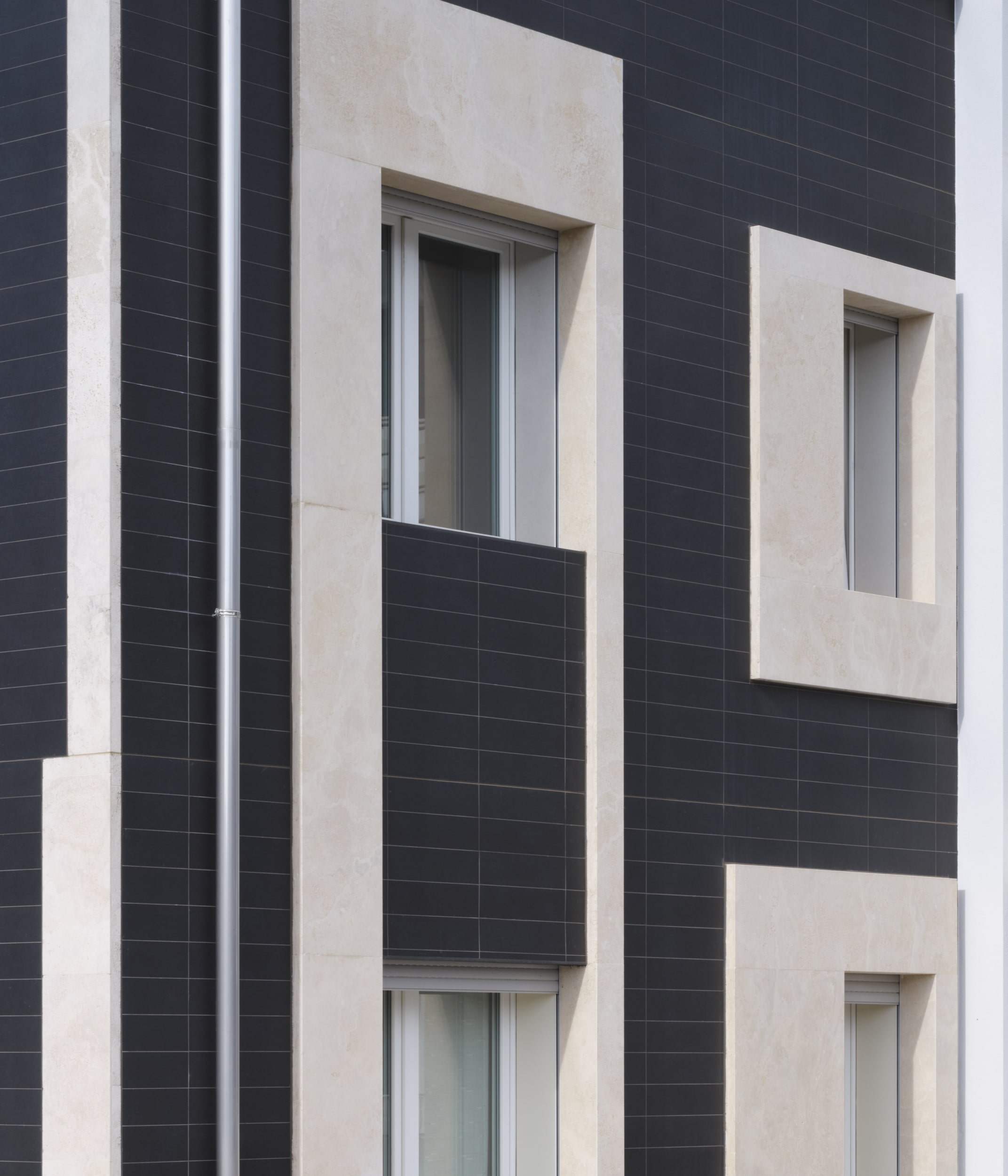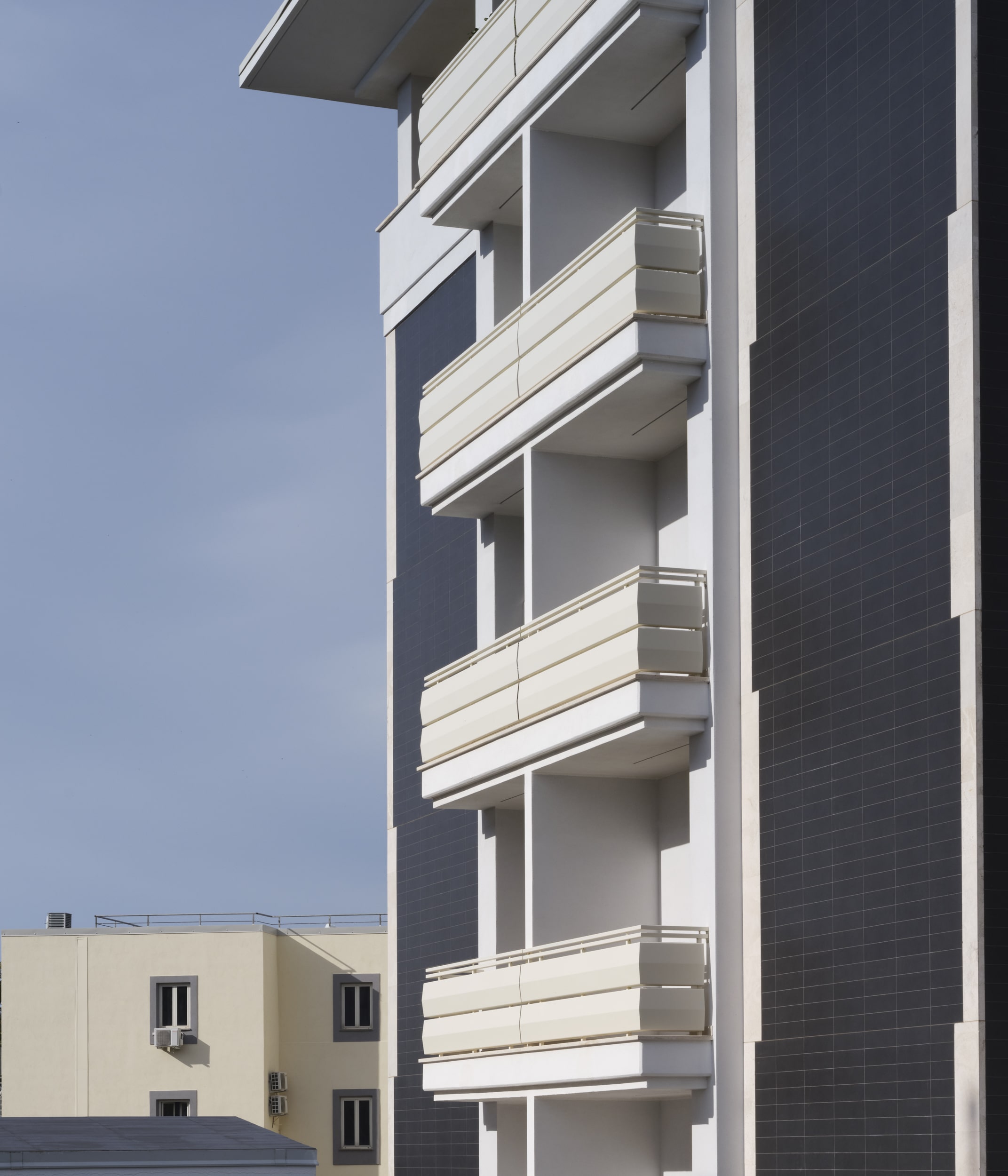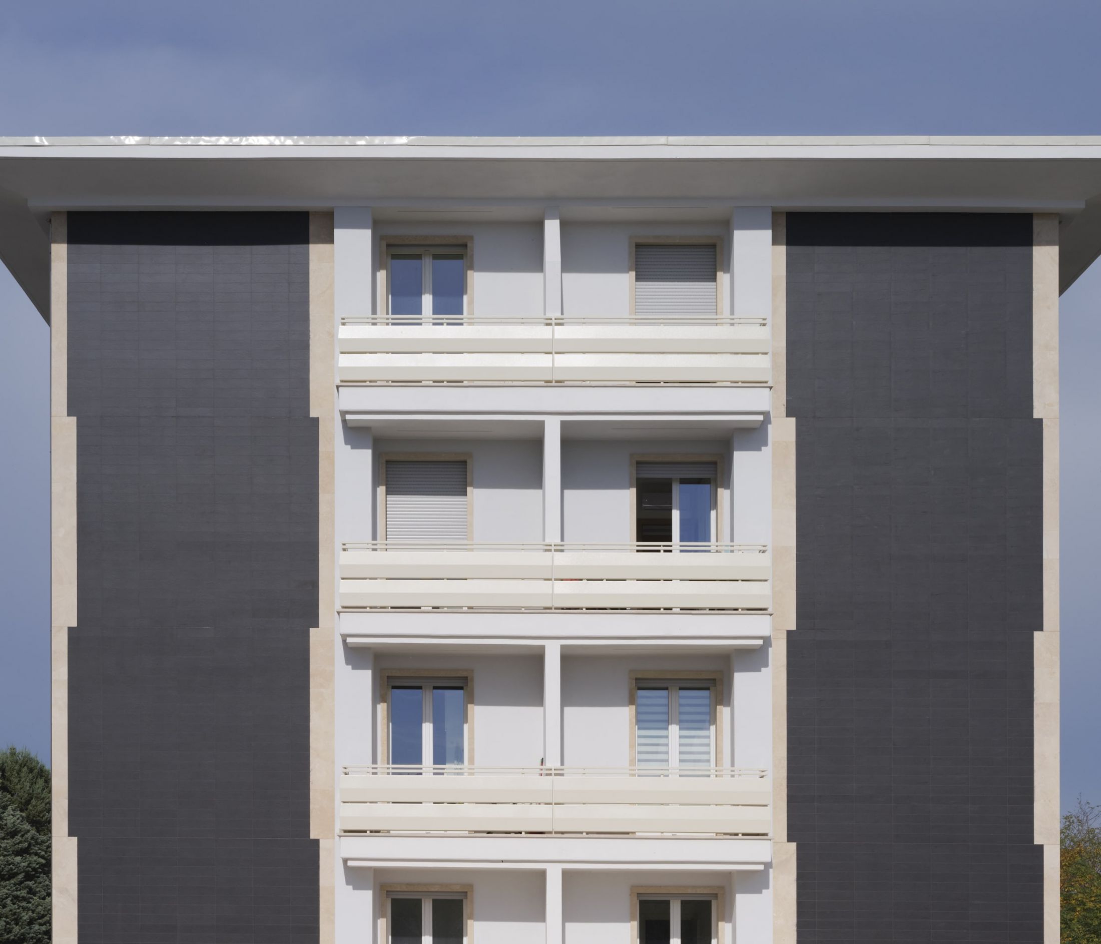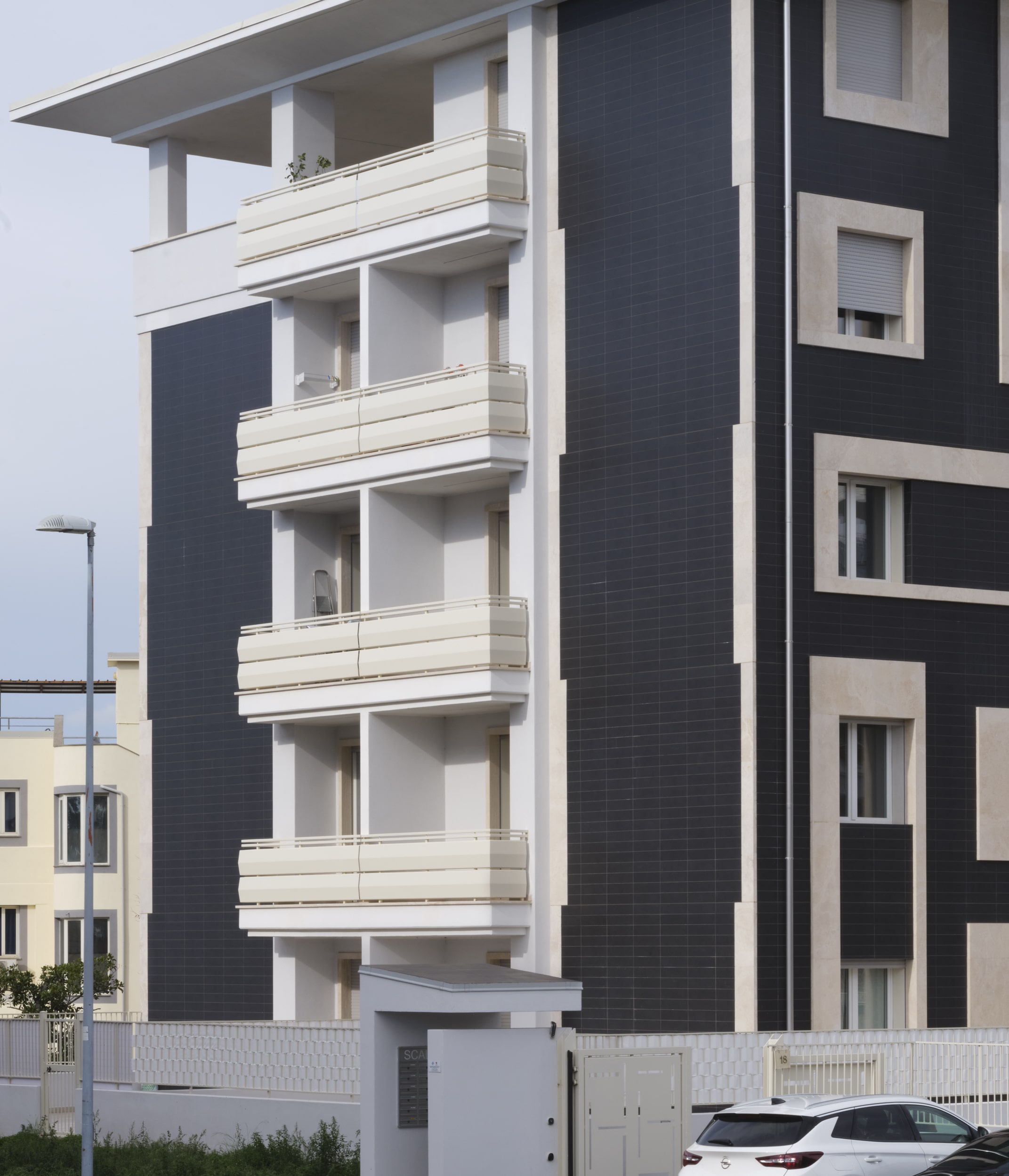Rigore geometrico, colori a contrasto, mix di materiali e superfici. Così si caratterizzano le tre palazzine residenziali del complesso viterbese, riuscendo a spiccare e rendersi fortemente riconoscibili nel contesto.