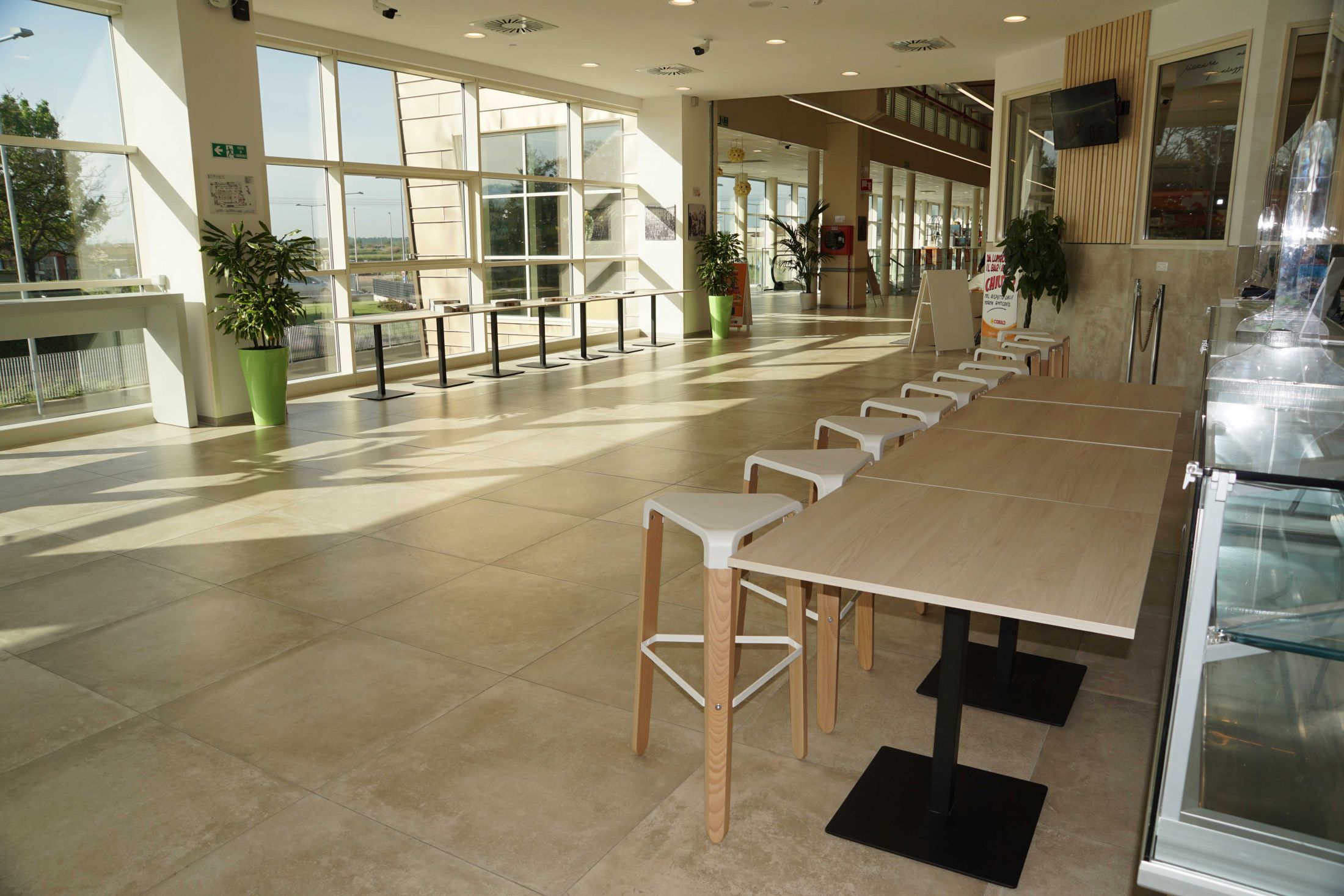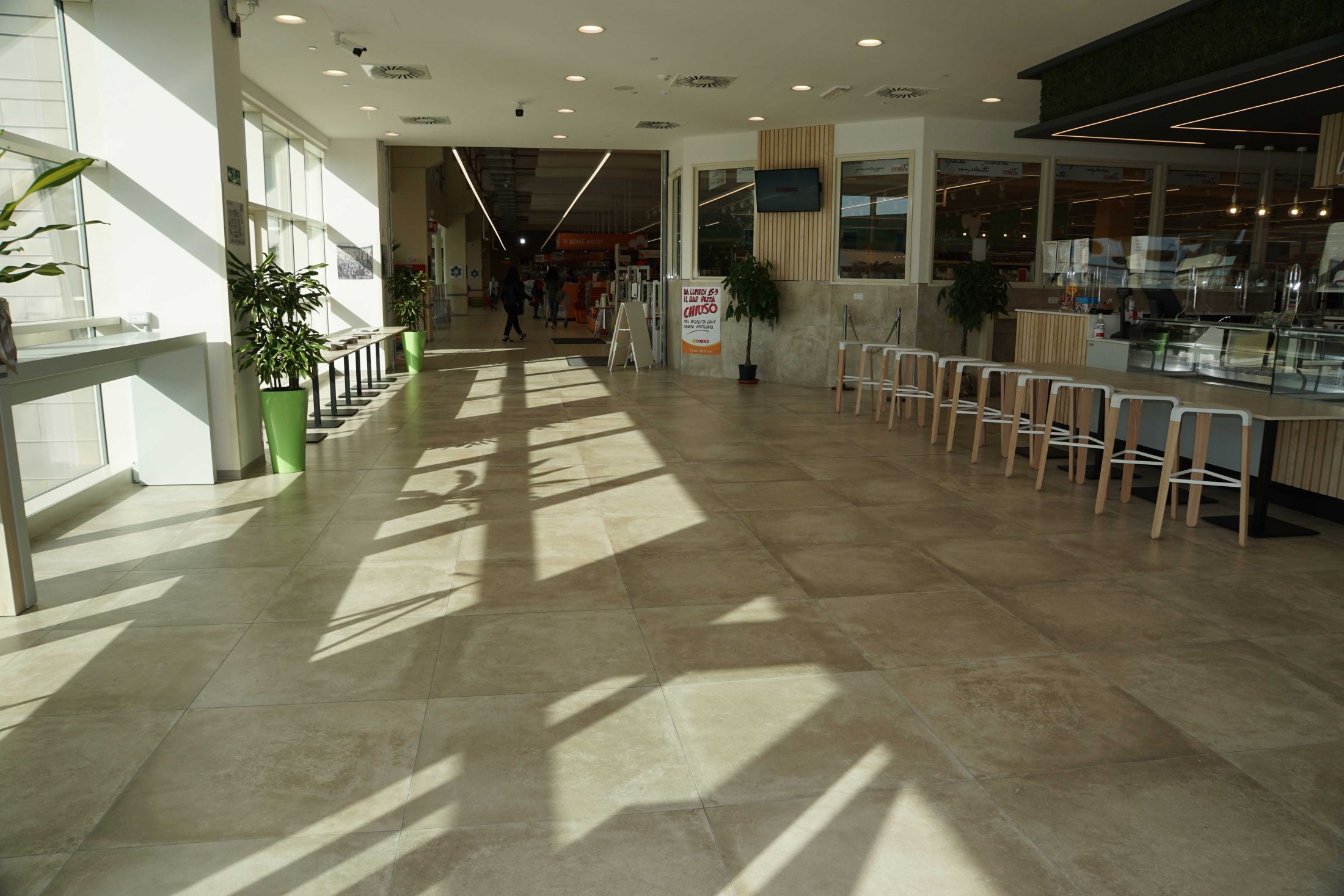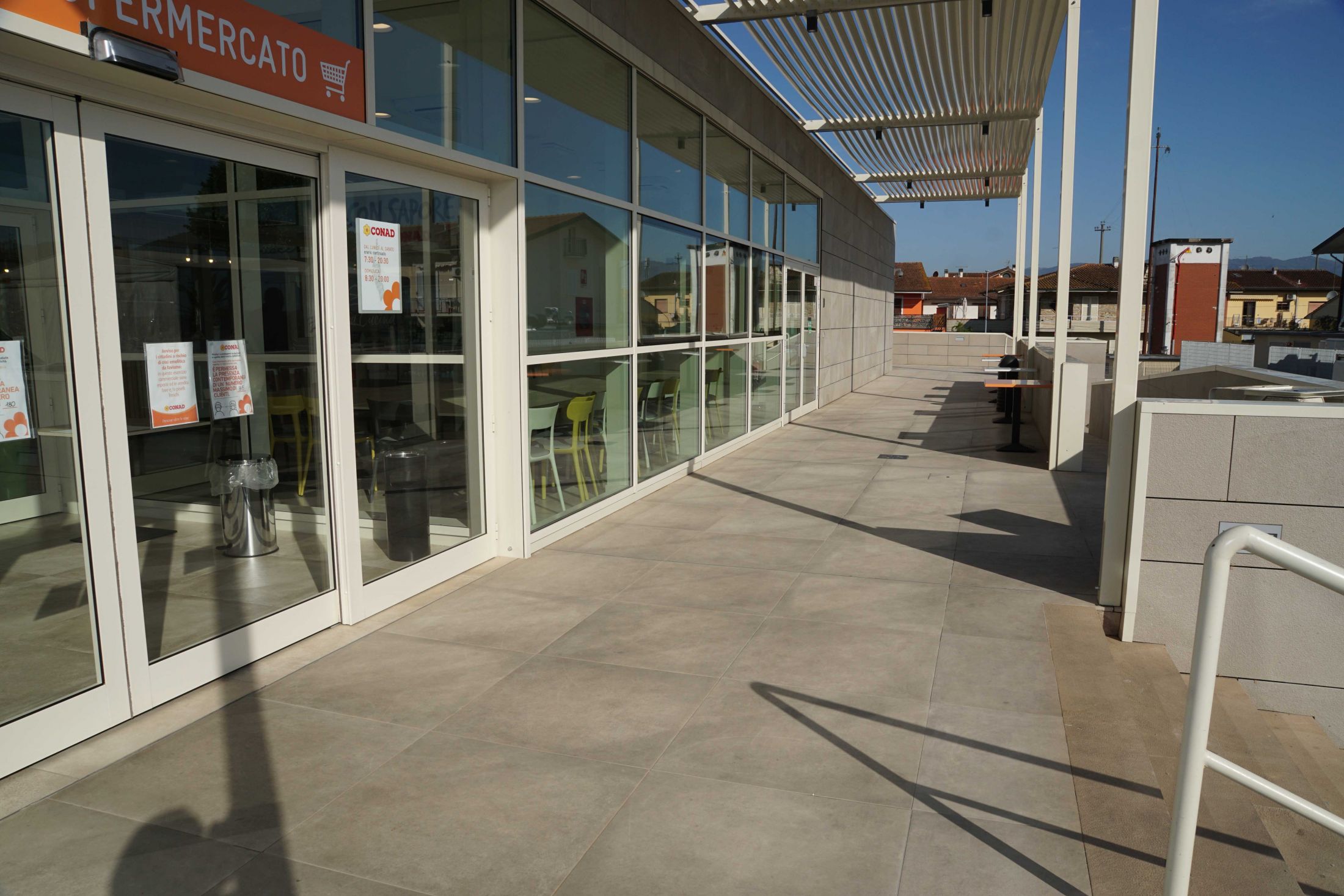 Conad sceglie Reden Ivory by Cerdisa per il suo centro commerciale in provincia di Pistoia. Il colore luminoso di Reden Ivory 80x80 uniforma l’interno con il porticato esterno, dove viene utilizzato in finitura grip e 20 mm di spessore, attraverso la bussola di ingresso vetrata.