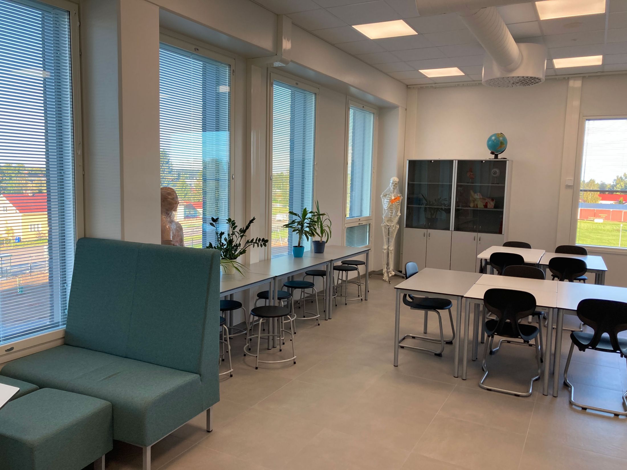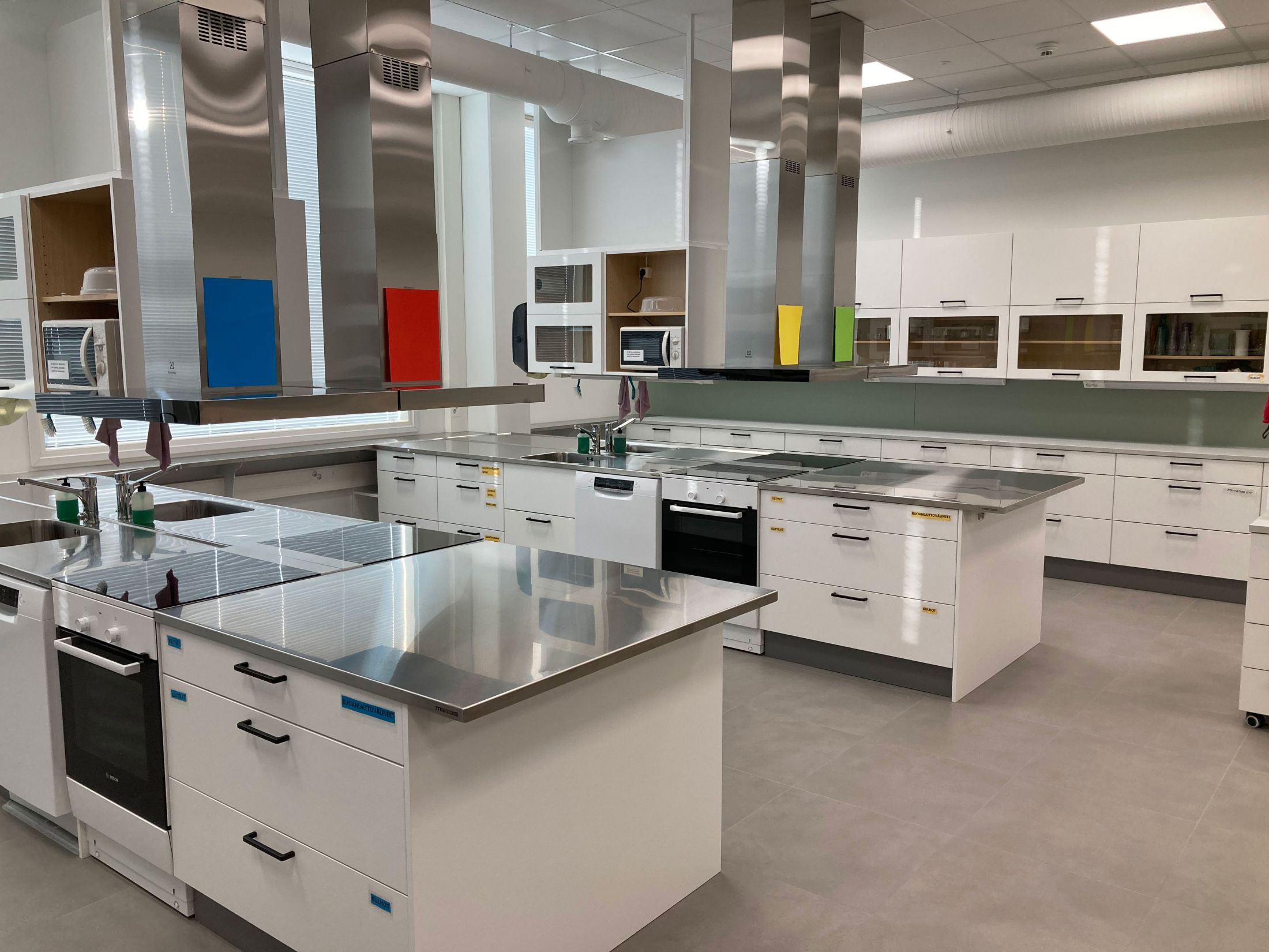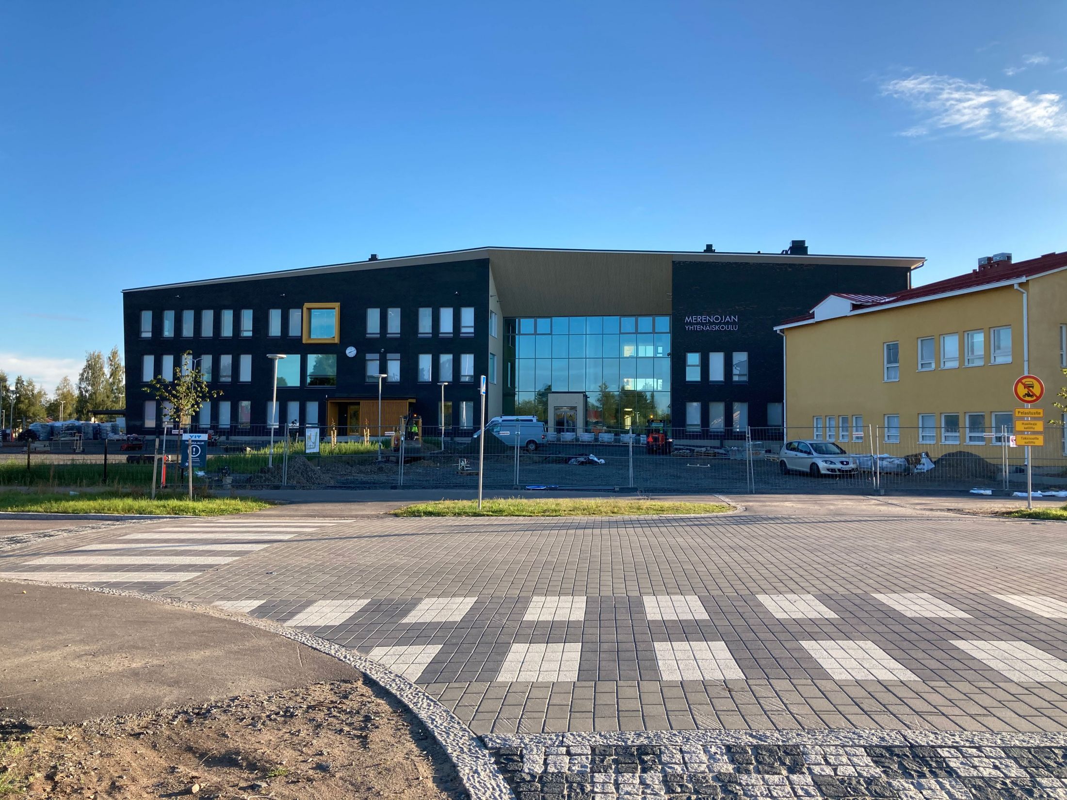 Il distretto di Merenoja comprende scuole, asili, servizi sociali ed alloggi per famiglie. Si tratta di un sistema di inclusione che parte dalle scuole di base, inserite in istituti comprensivi e altri servizi legati all’infanzia, fino alle scuole superiori. La scelta delle soluzioni estetiche per la realizzazione degli interni mette la luminosità in primo piano, con materiali e colori diversi utilizzati per pavimentazioni e rivestimenti. In particolare la scelta di elementi in ceramica effetto pietra a pavimentazione delle aule didattiche è pensata come elemento caratterizzante, e differente rispetto alle superfici più neutre e dai colori più uniformi di laboratori e ambienti di servizio. La grande varietà delle superfici ceramiche diventa strumento progettuale per la differenziazione delle destinazioni d’uso.