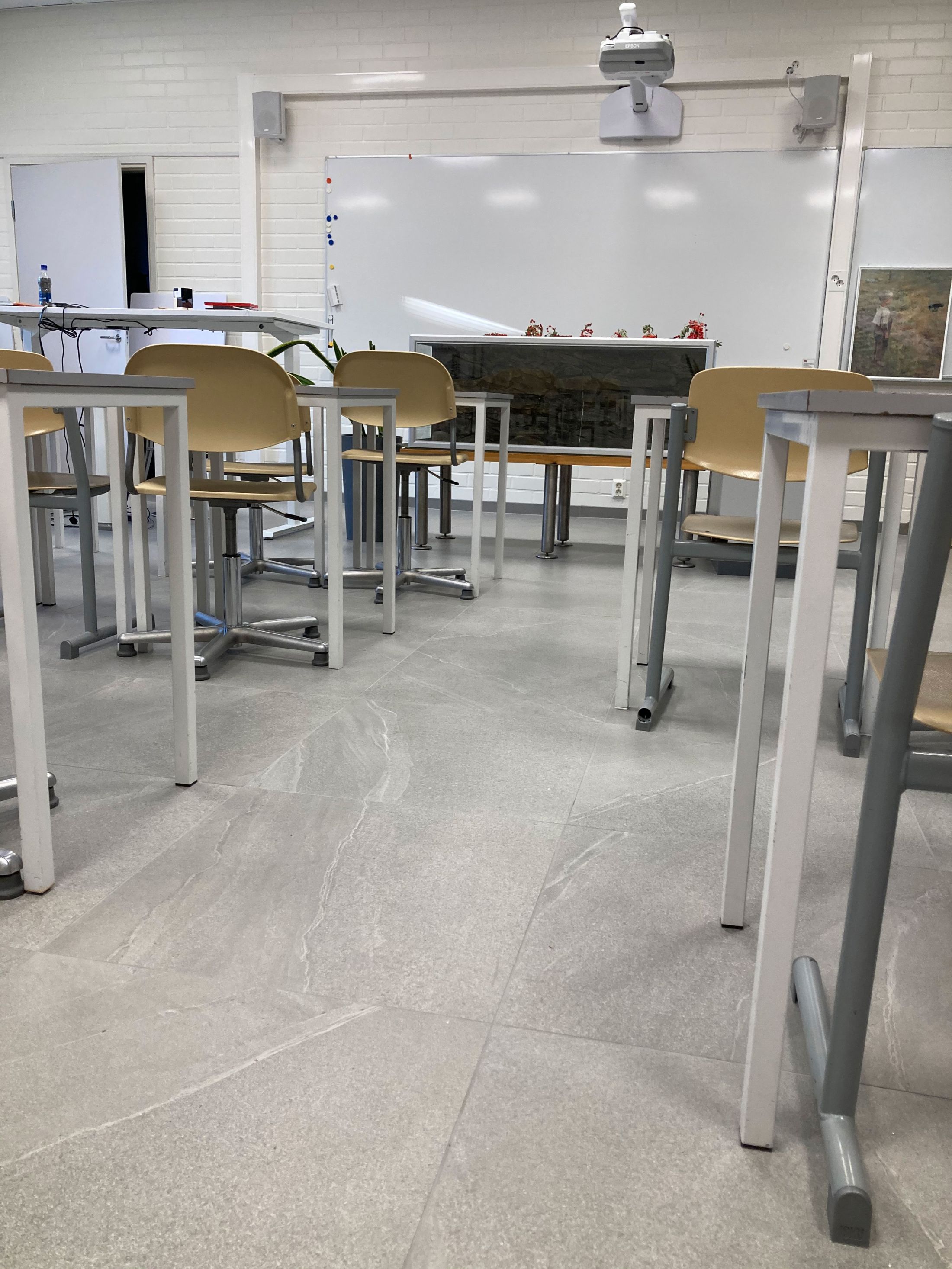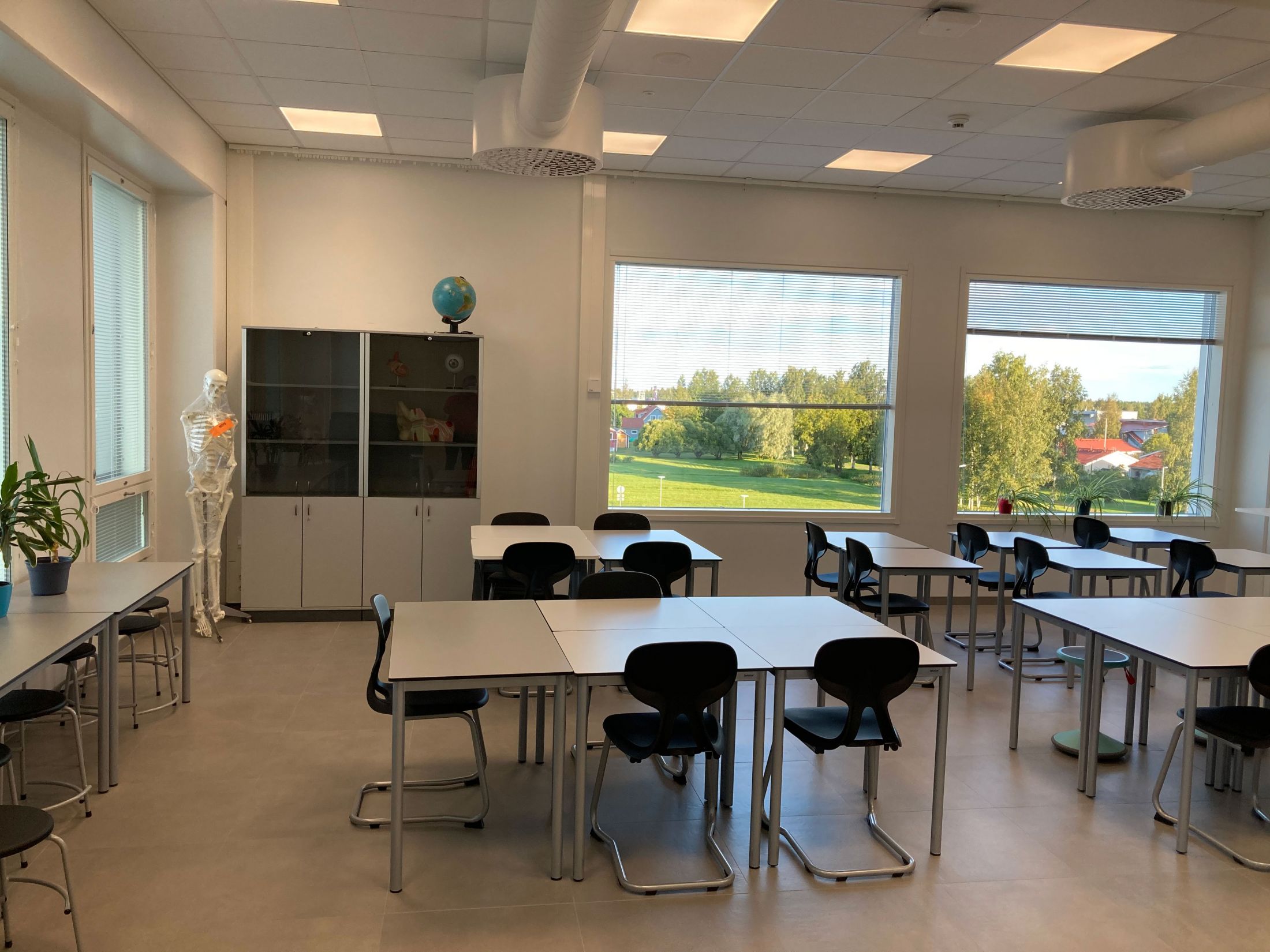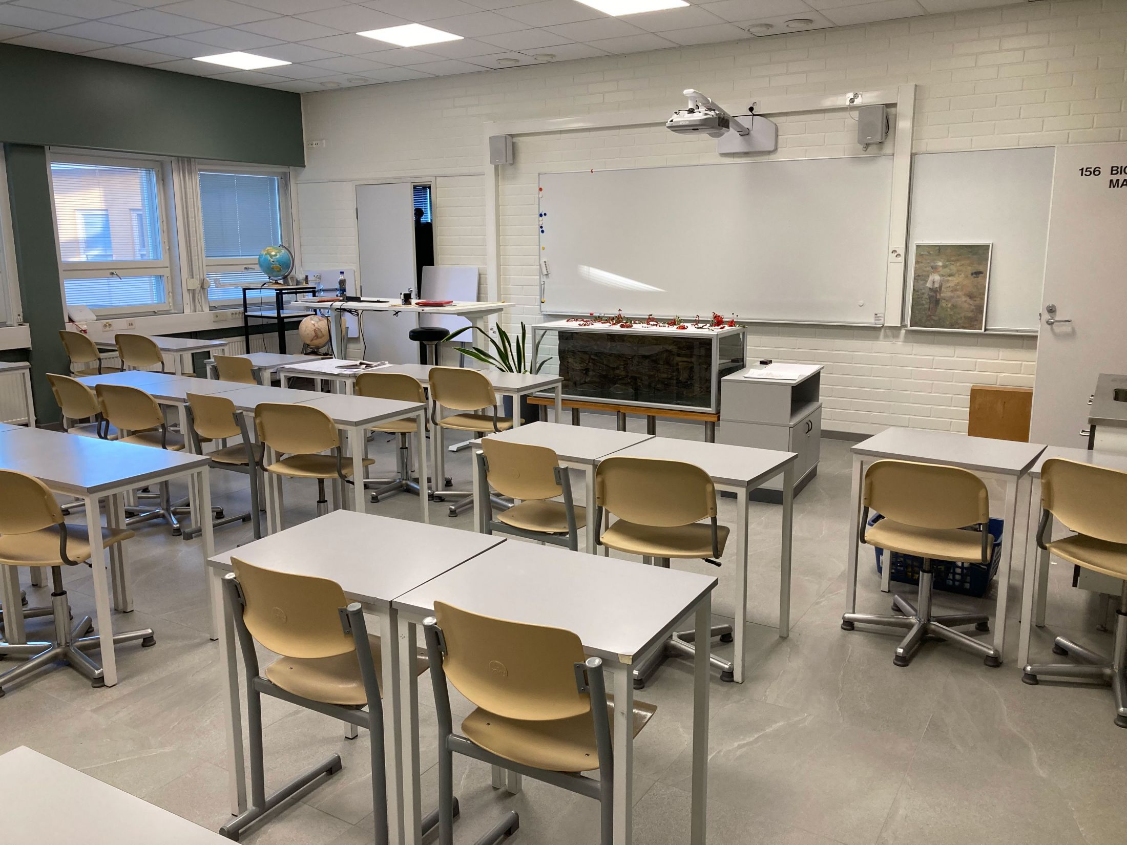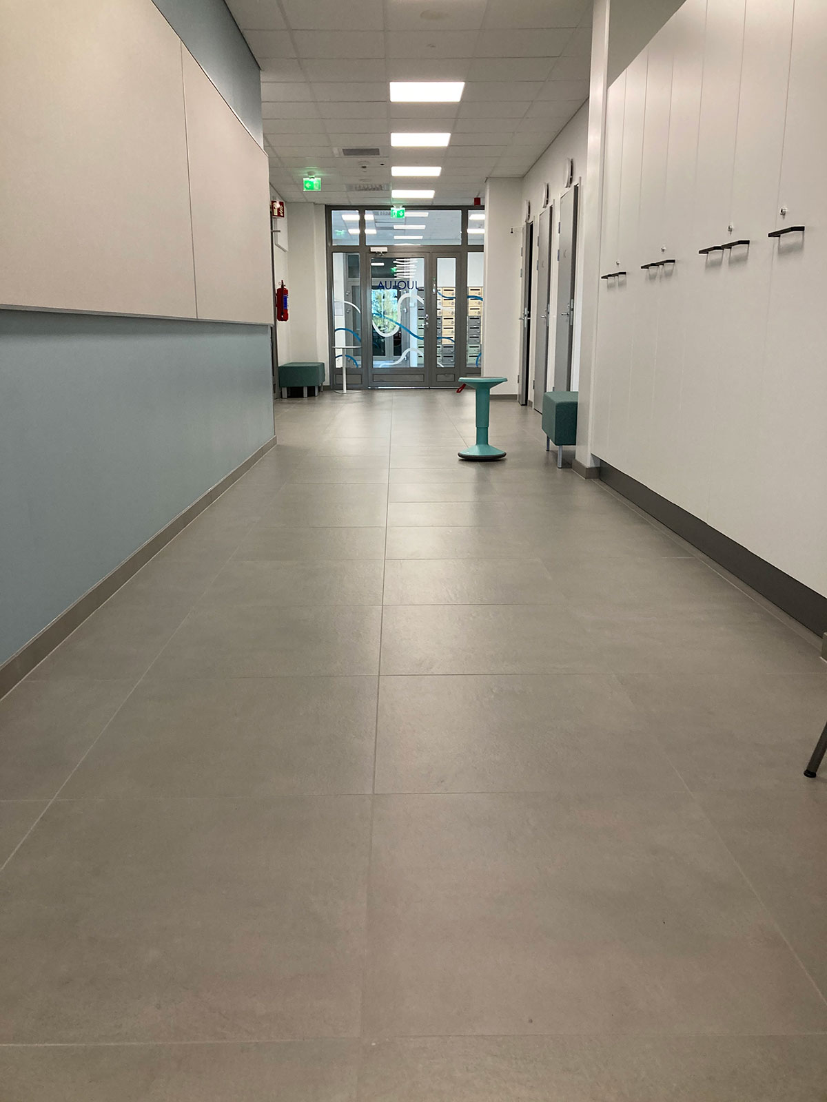 Il distretto di Merenoja comprende scuole, asili, servizi sociali ed alloggi per famiglie. Si tratta di un sistema di inclusione che parte dalle scuole di base, inserite in istituti comprensivi e altri servizi legati all’infanzia, fino alle scuole superiori. La scelta delle soluzioni estetiche per la realizzazione degli interni mette la luminosità in primo piano, con materiali e colori diversi utilizzati per pavimentazioni e rivestimenti. In particolare la scelta di elementi in ceramica effetto pietra a pavimentazione delle aule didattiche è pensata come elemento caratterizzante, e differente rispetto alle superfici più neutre e dai colori più uniformi di laboratori e ambienti di servizio. La grande varietà delle superfici ceramiche diventa strumento progettuale per la differenziazione delle destinazioni d’uso.