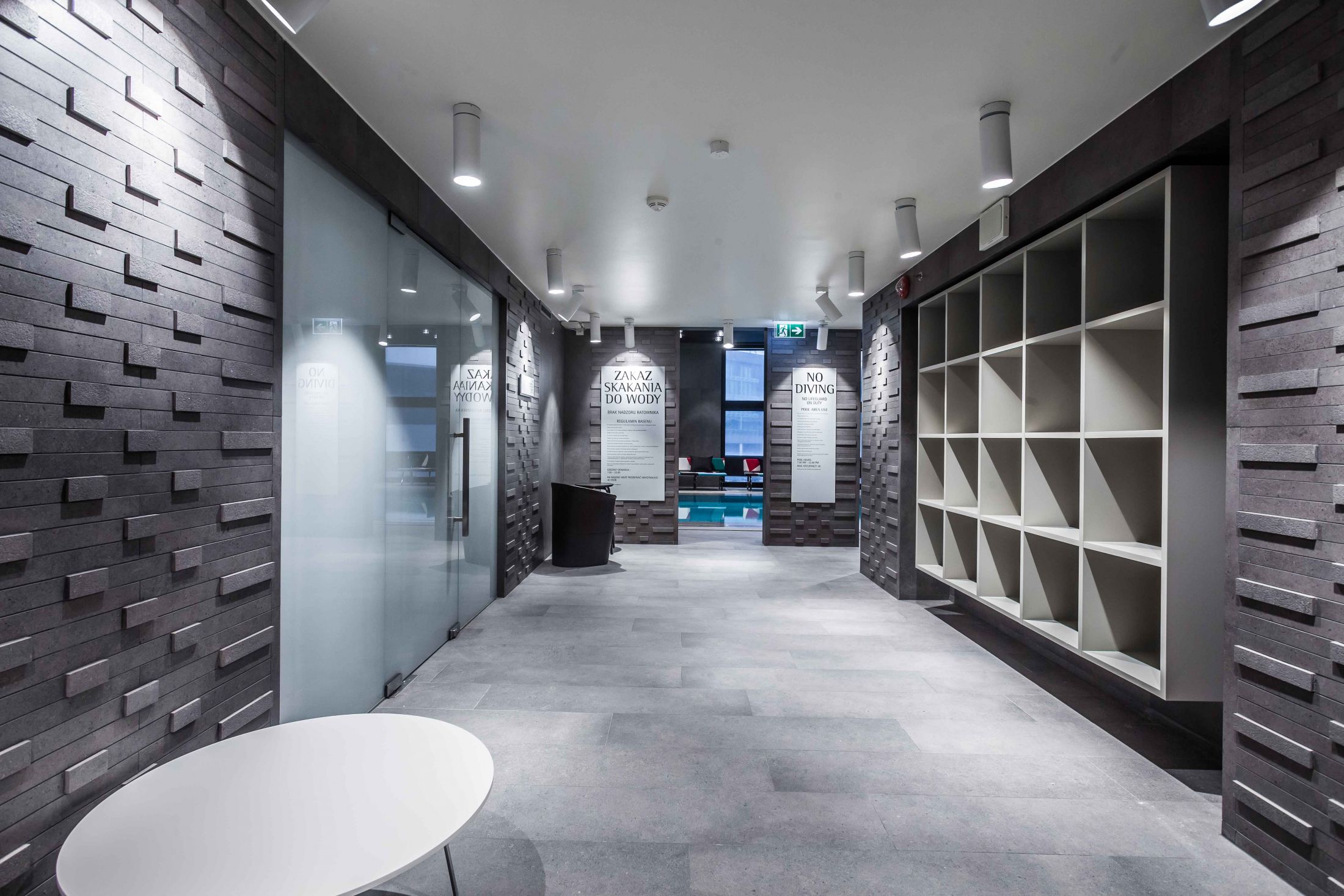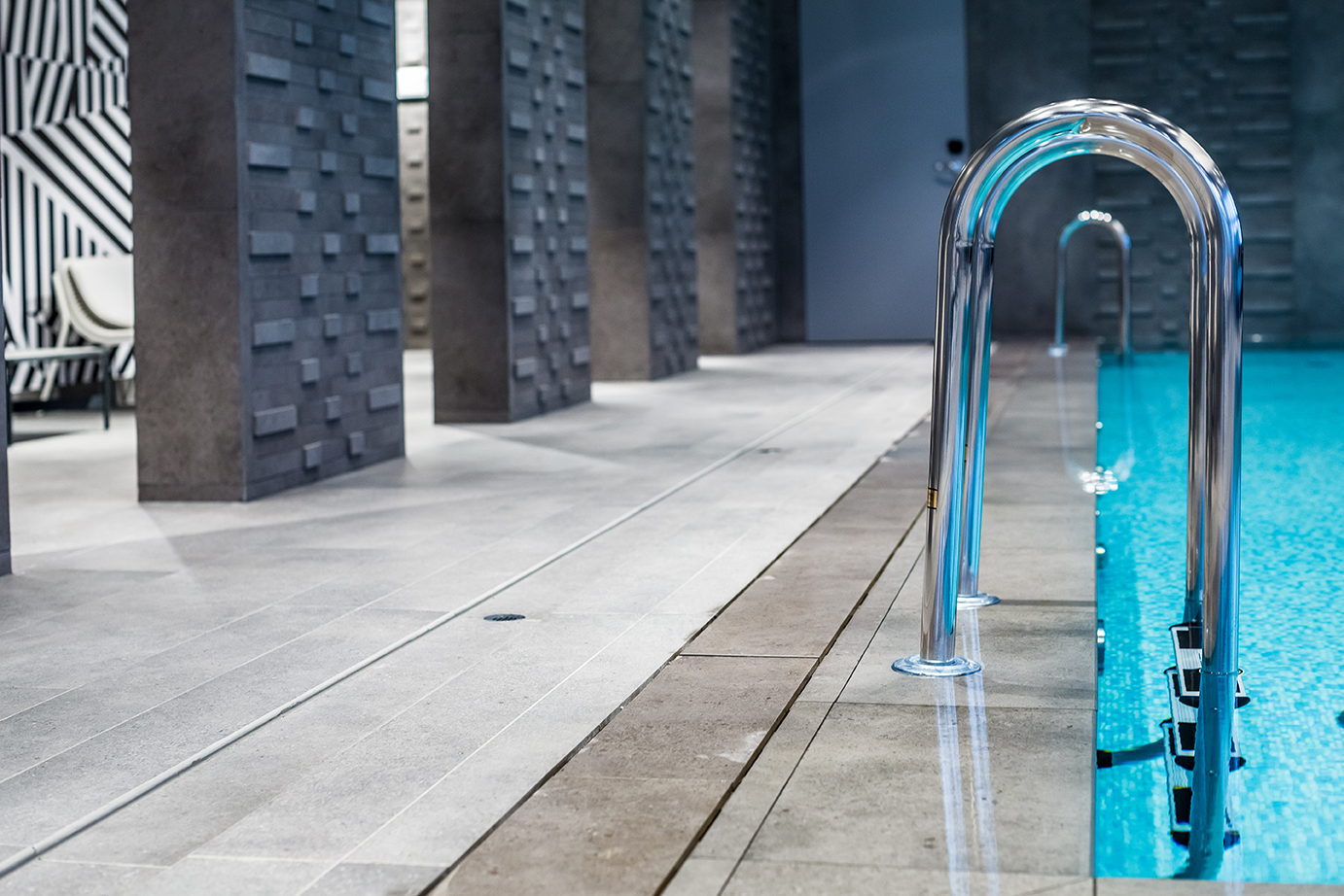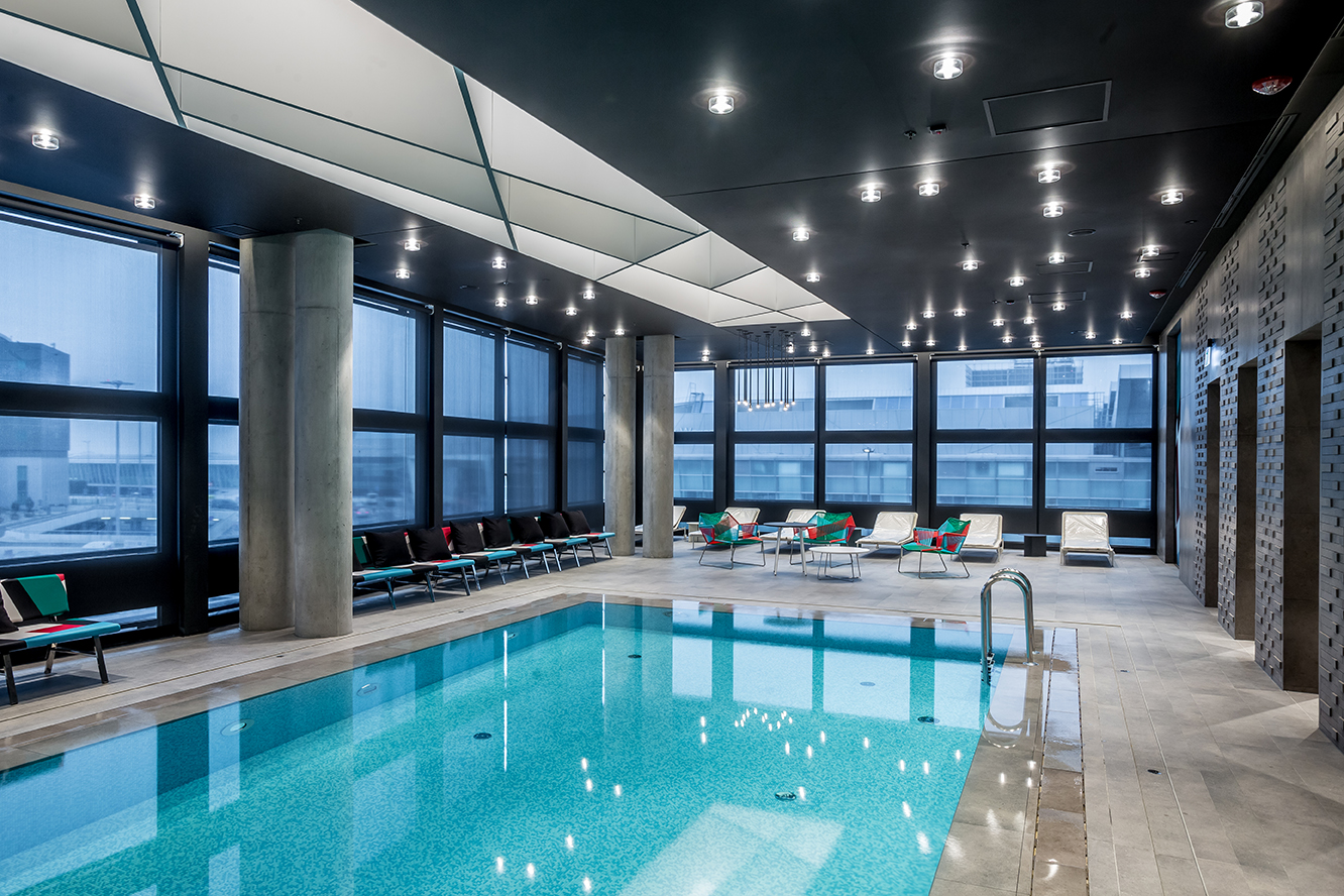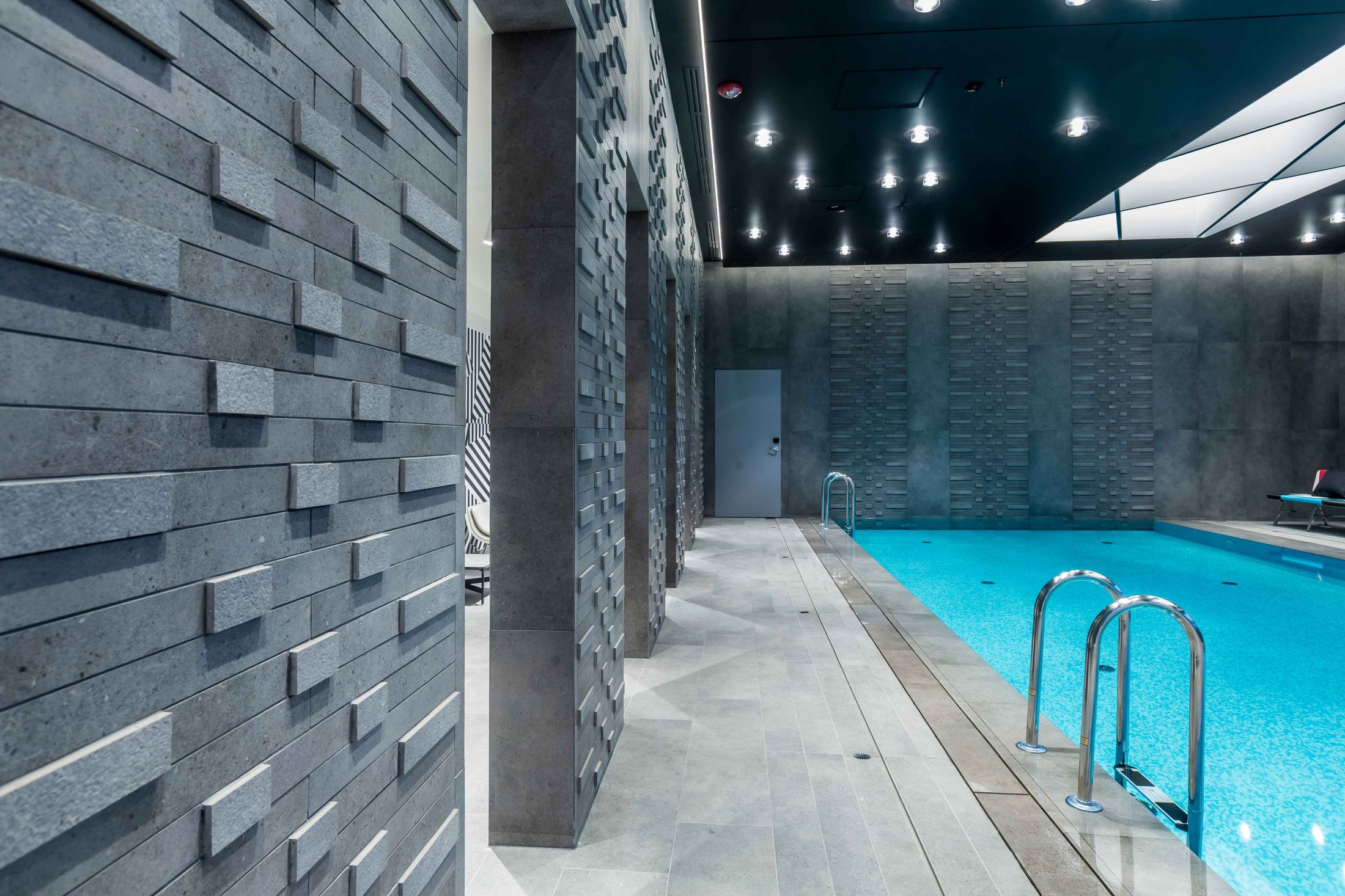 Un grande albergo in zona aeroportuale, parte di una importante catena internazionale, pensato per ospiti esigenti. La zona wellness si caratterizza per dettagli estremamente ricercati e colori tecnici: gli elementi customizzati per la zona vasca caratterizzano con il loro disegno l’ambiente, mentre le quinte murarie, che creano aree riservate, sono caratterizzate da un disegno di superficie tridimensionale.