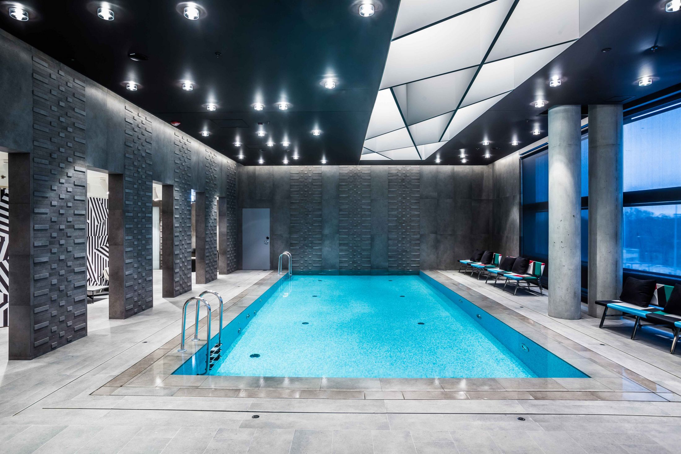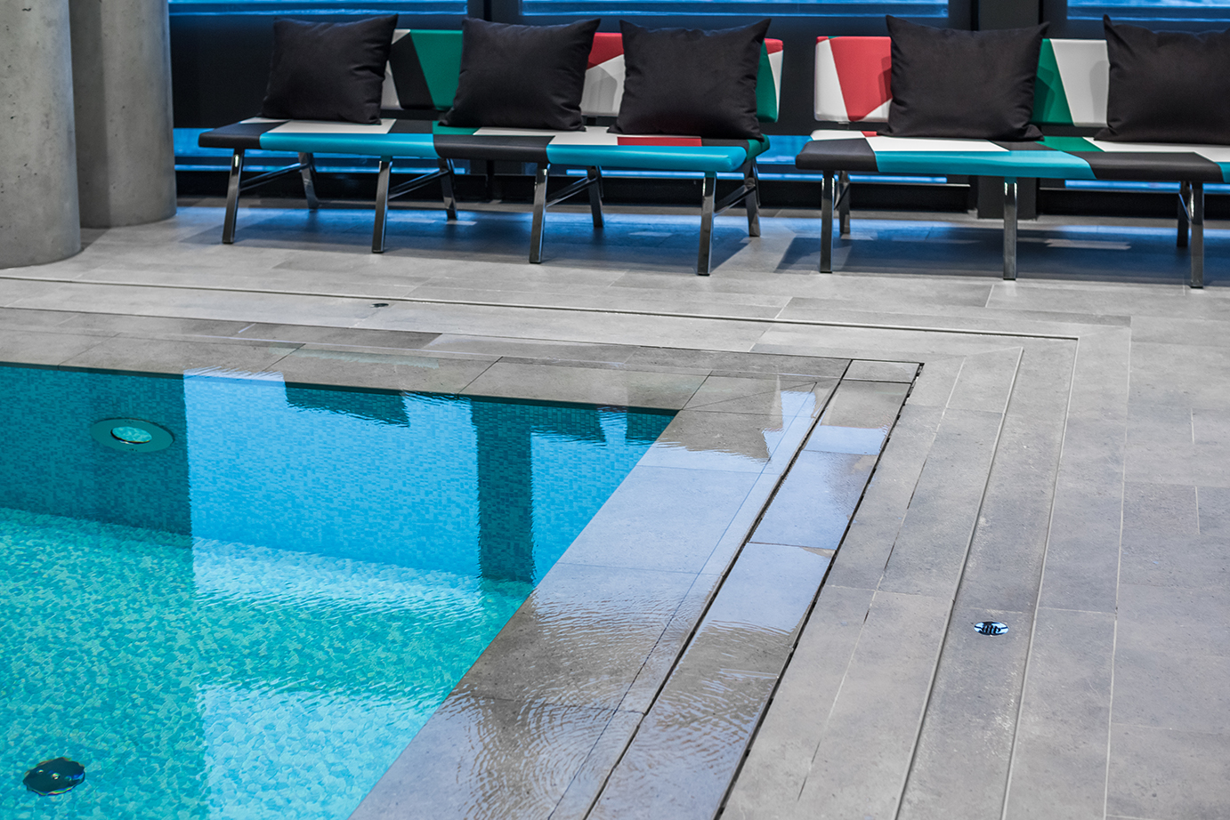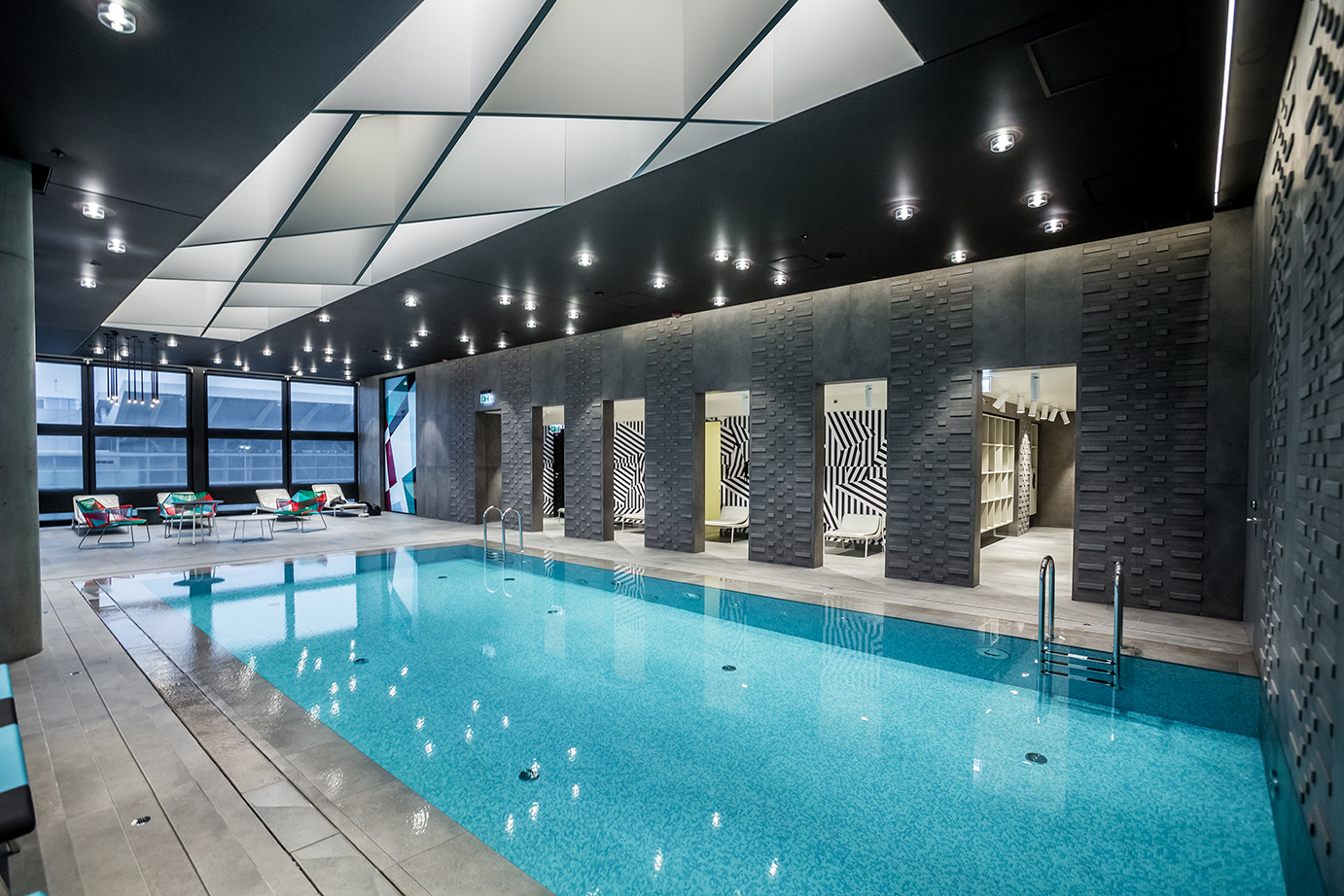 Un grande albergo in zona aeroportuale, parte di una importante catena internazionale, pensato per ospiti esigenti. La zona wellness si caratterizza per dettagli estremamente ricercati e colori tecnici: gli elementi customizzati per la zona vasca caratterizzano con il loro disegno l’ambiente, mentre le quinte murarie, che creano aree riservate, sono caratterizzate da un disegno di superficie tridimensionale.