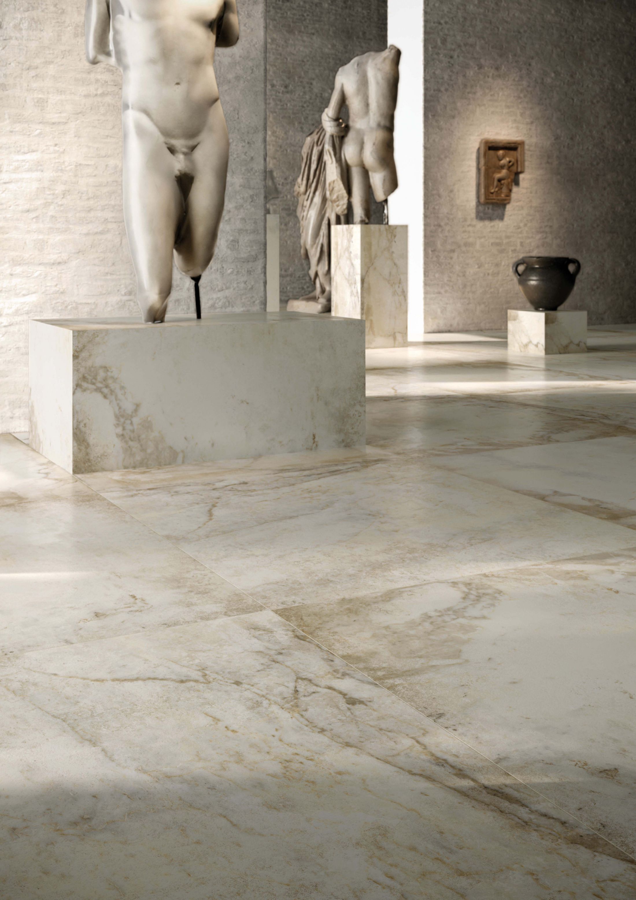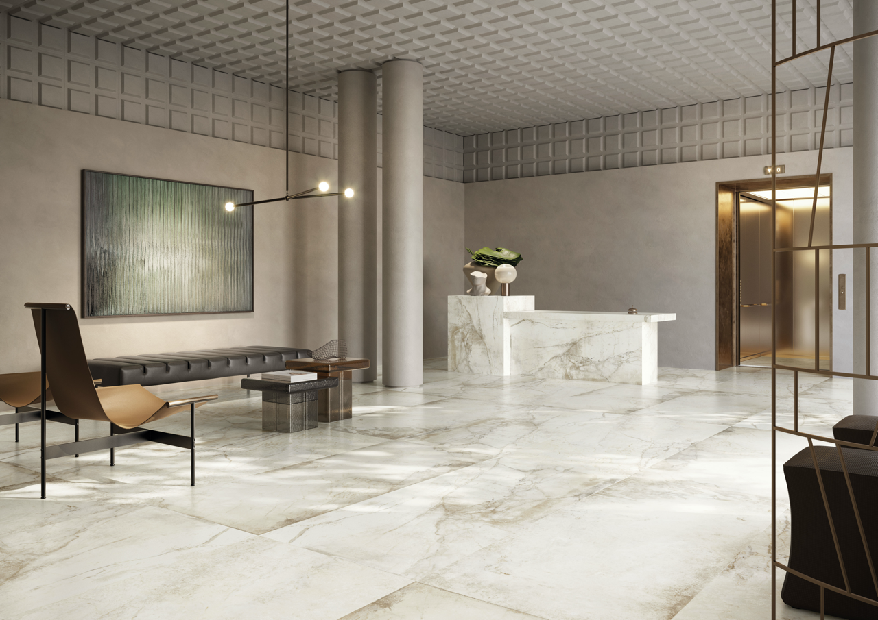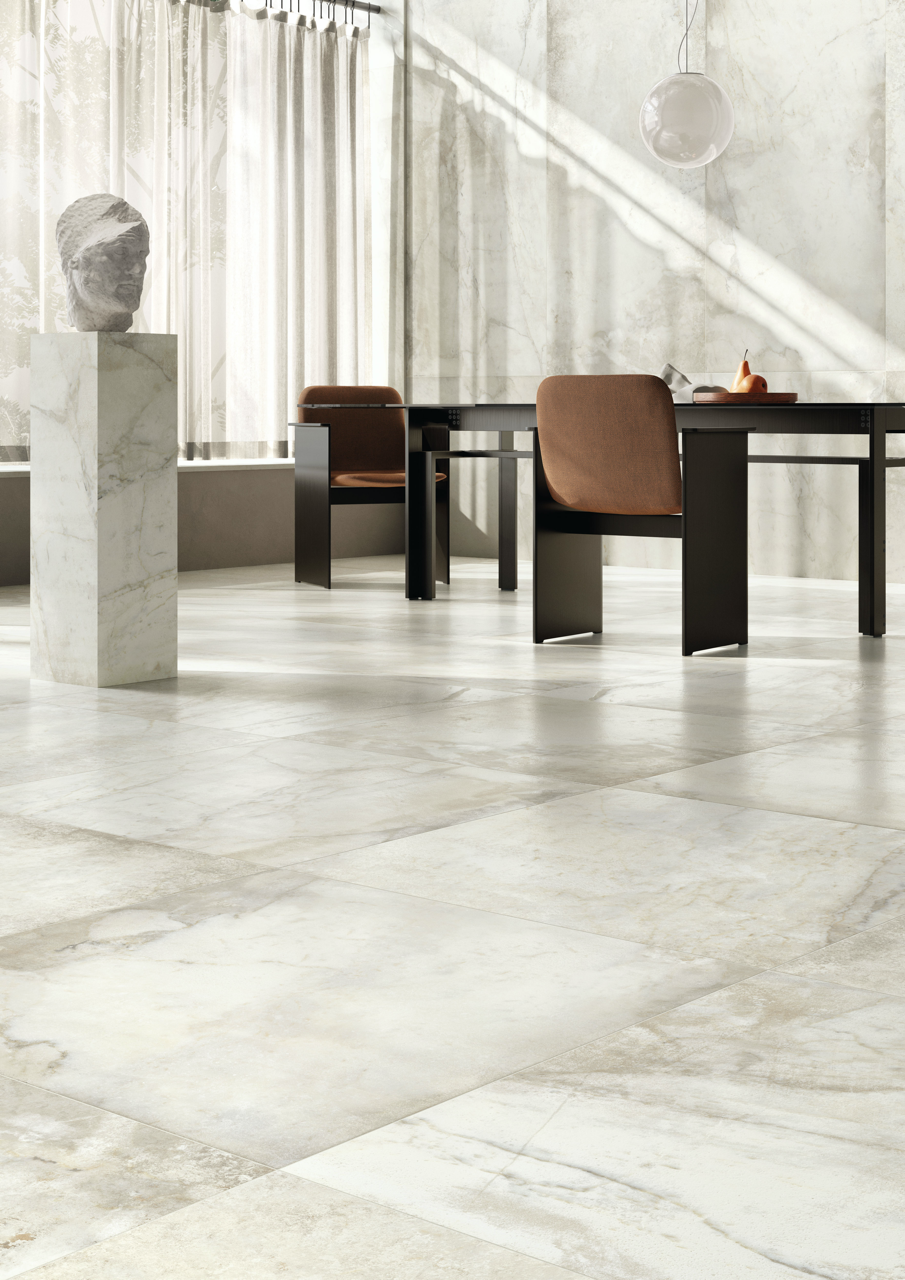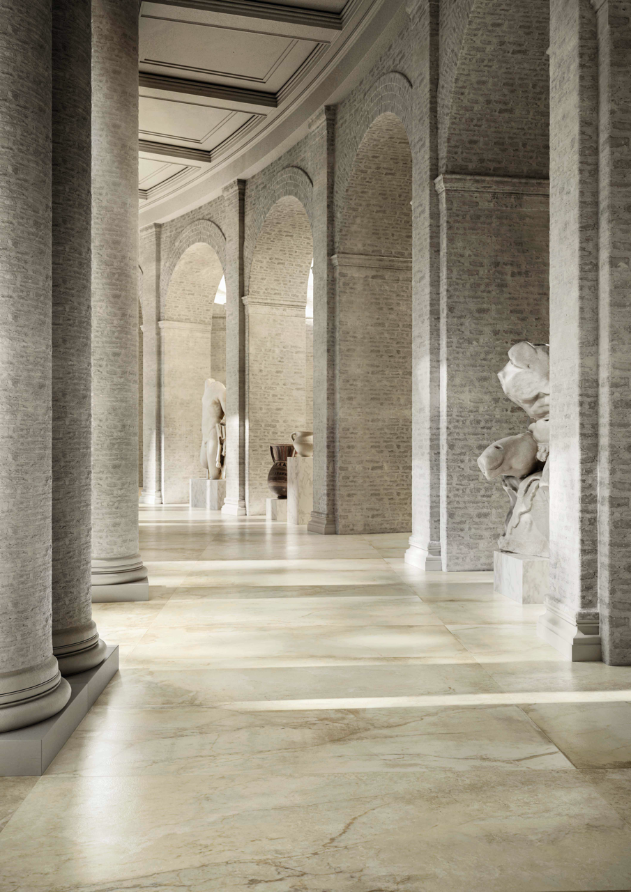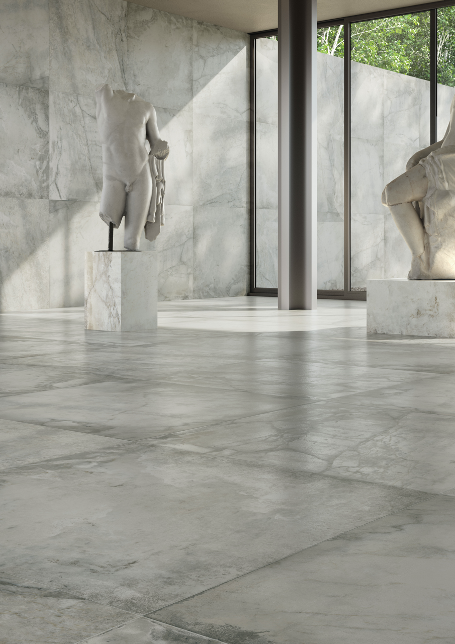 Una pura invenzione, espressione compiuta della ceramica industriale di design di ultima generazione. Un omaggio alla scultura, che prende forma attraverso alcuni dei suoi materiali più utilizzati, comunque non consueti: l’avorio, il cristallo, il gesso, contaminati da venature effetto marmo e screziature cementizie.