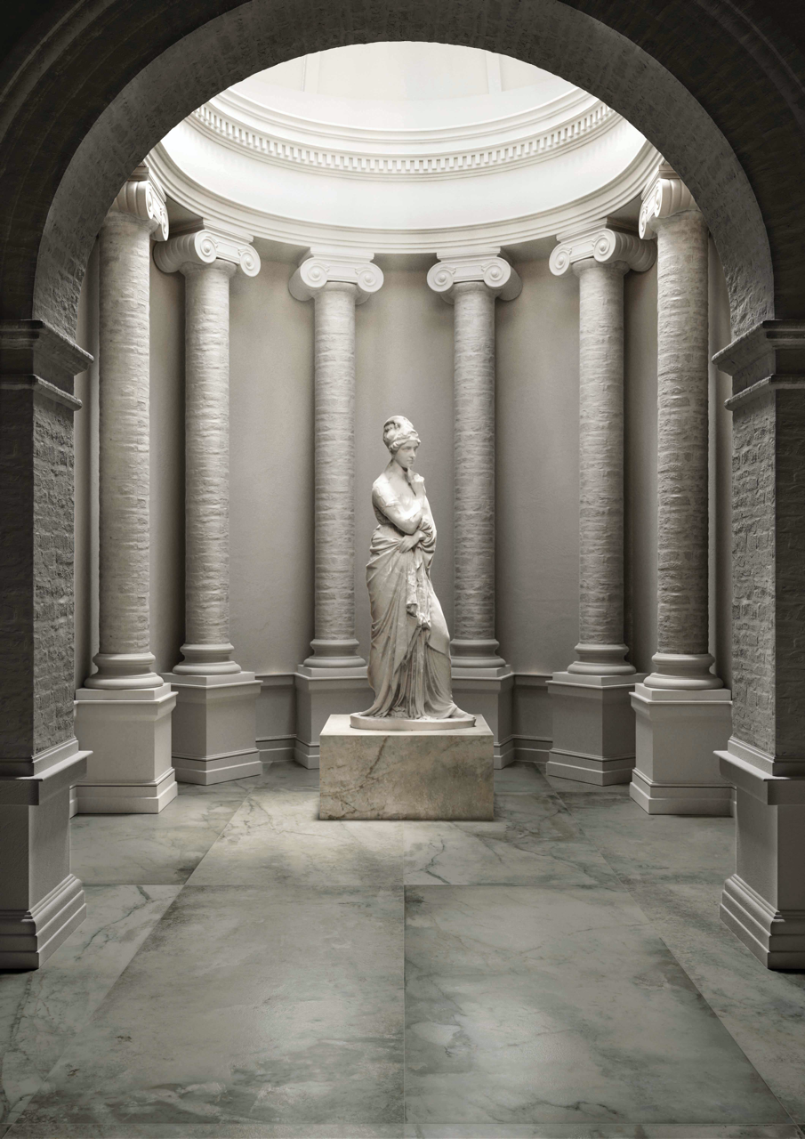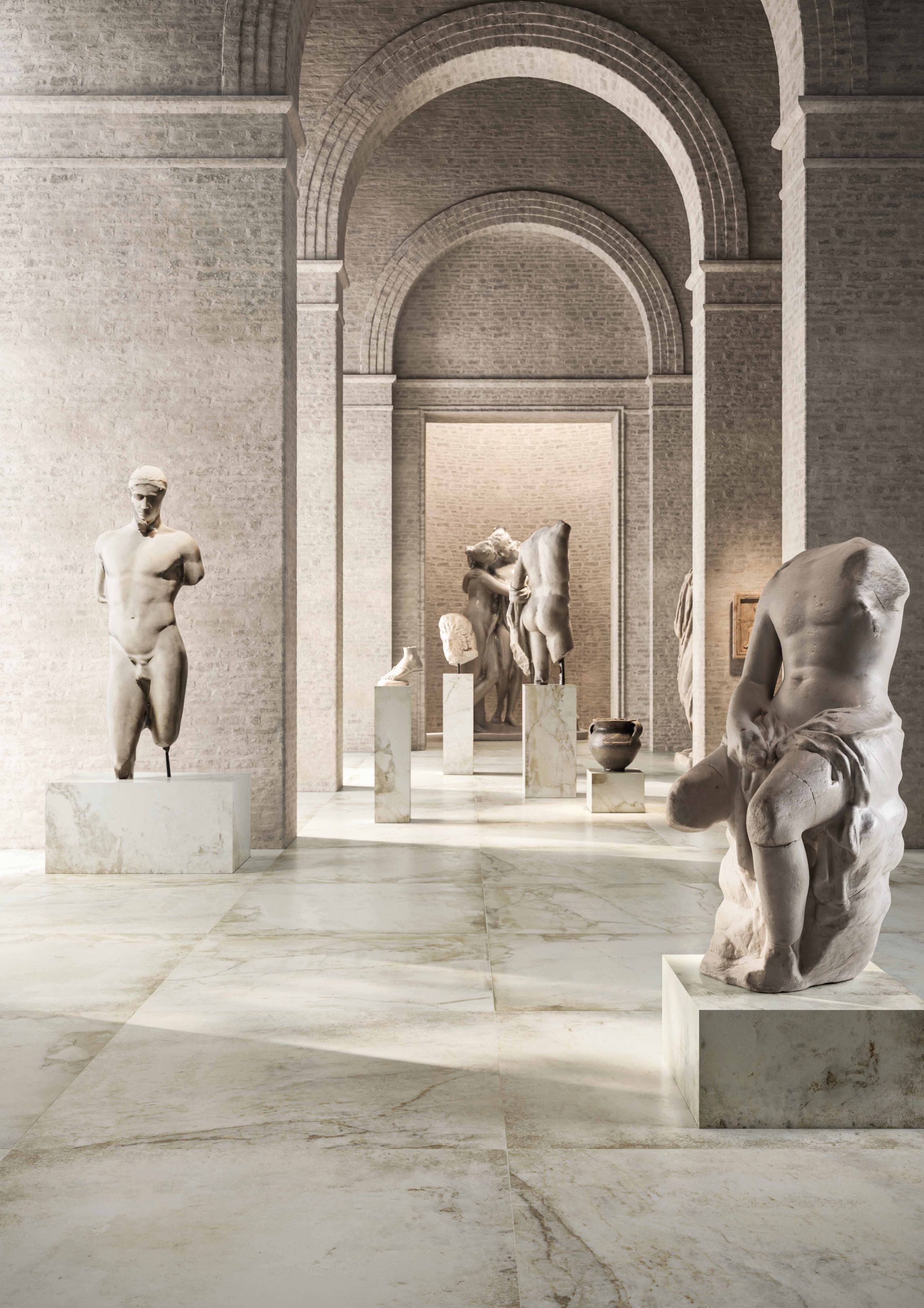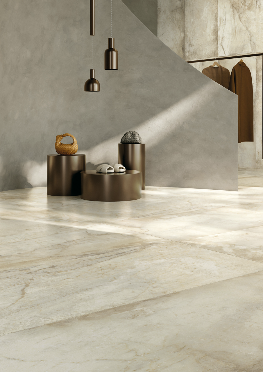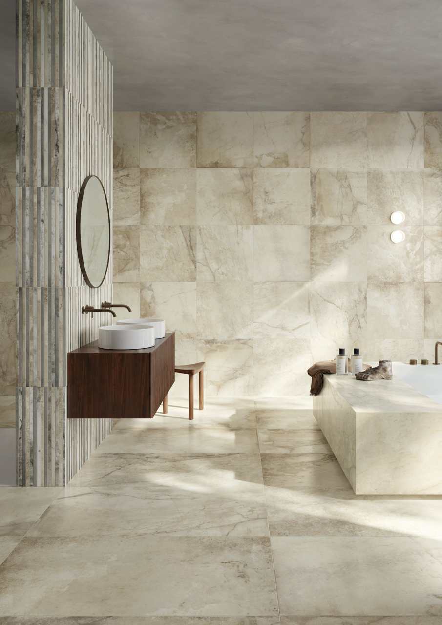 Una pura invenzione, espressione compiuta della ceramica industriale di design di ultima generazione. Un omaggio alla scultura, che prende forma attraverso alcuni dei suoi materiali più utilizzati, comunque non consueti: l’avorio, il cristallo, il gesso, contaminati da venature effetto marmo e screziature cementizie.