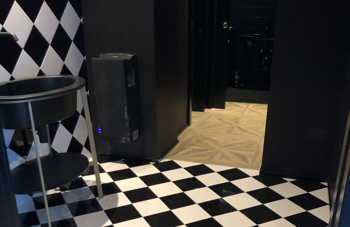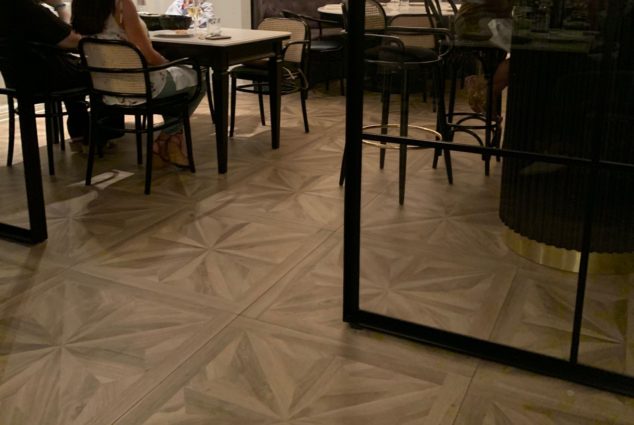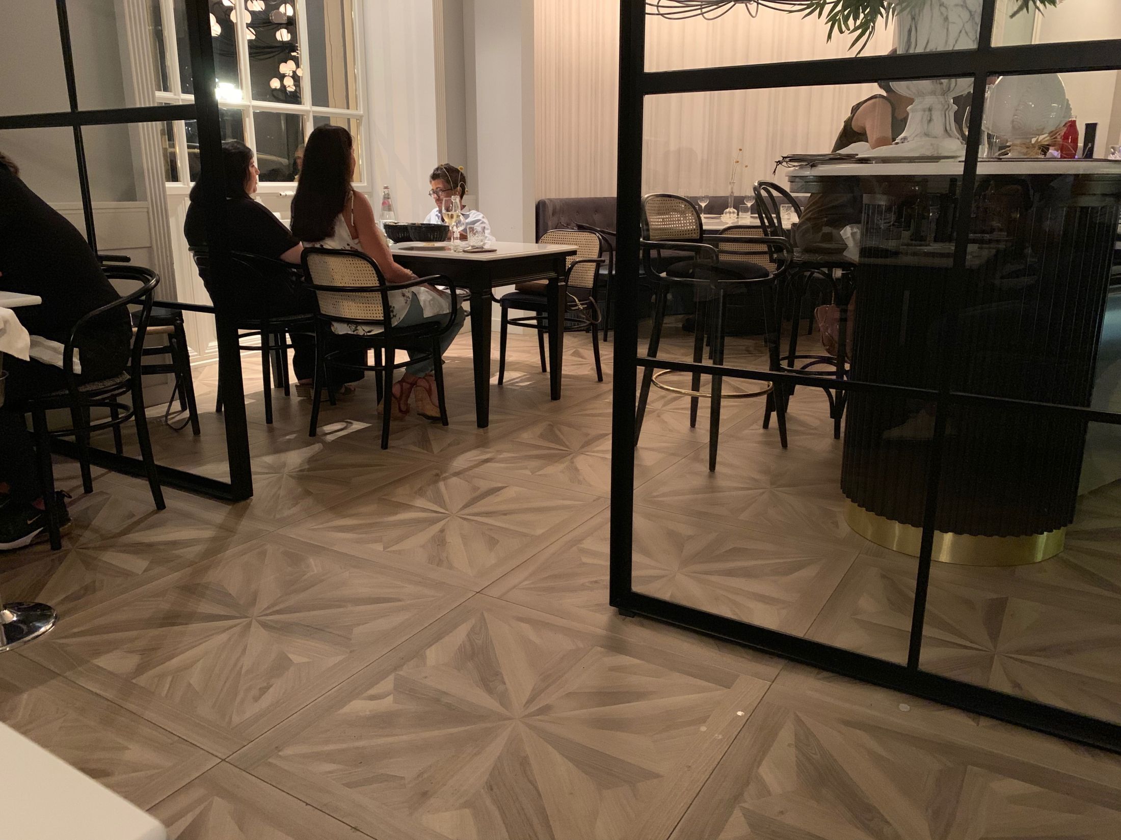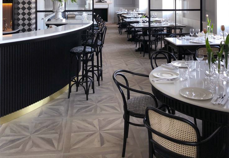 Il design interno si basa sull’eleganza senza tempo dei colori assoluti e del richiamo alle ambientazioni ed ai materiali tradizionali. I pavimenti e i rivestimenti ceramici completano il mood del locale, i grandi riquadri di Maison by Ricchetti richiamano incastri e giochi di essenze che fanno da cornice alla raffinatezza ed alla sobrietà degli arredi.