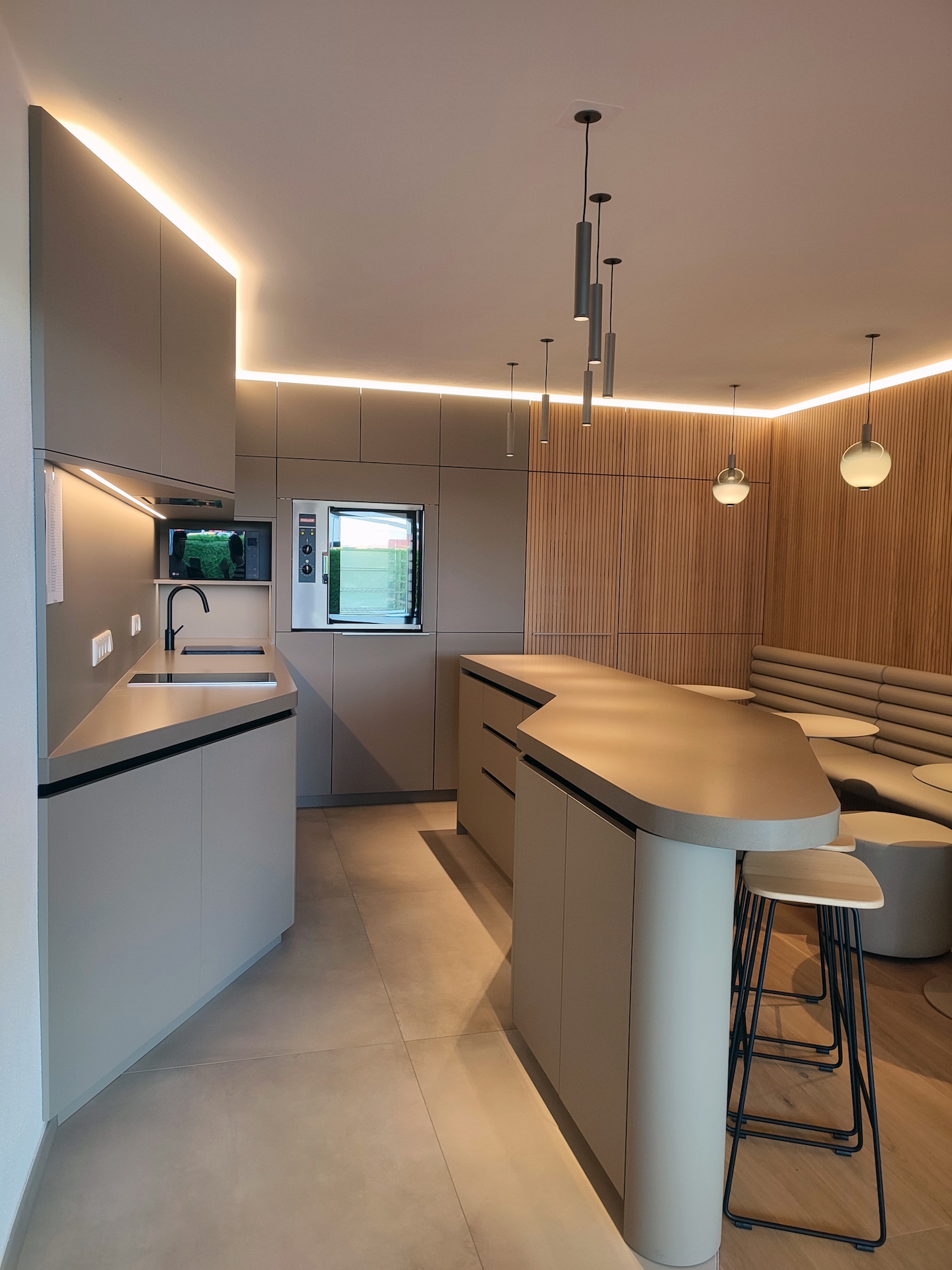 Nella zona comune dedicata a cucina e ristoro la scelta è ricaduta su Fresco Pearl 120x120 nt rt, una superficie chiara e materica che dona luminosità e continuità allo spazio integrandosi con i toni naturali del rovere e creando un ambiente chiaro e conviviale.