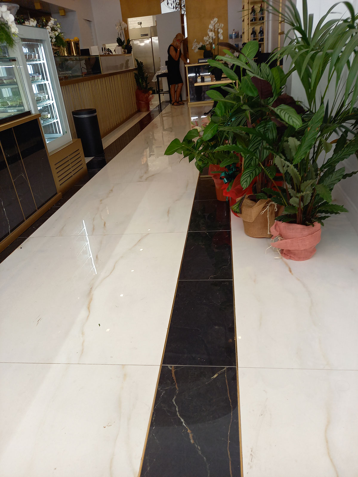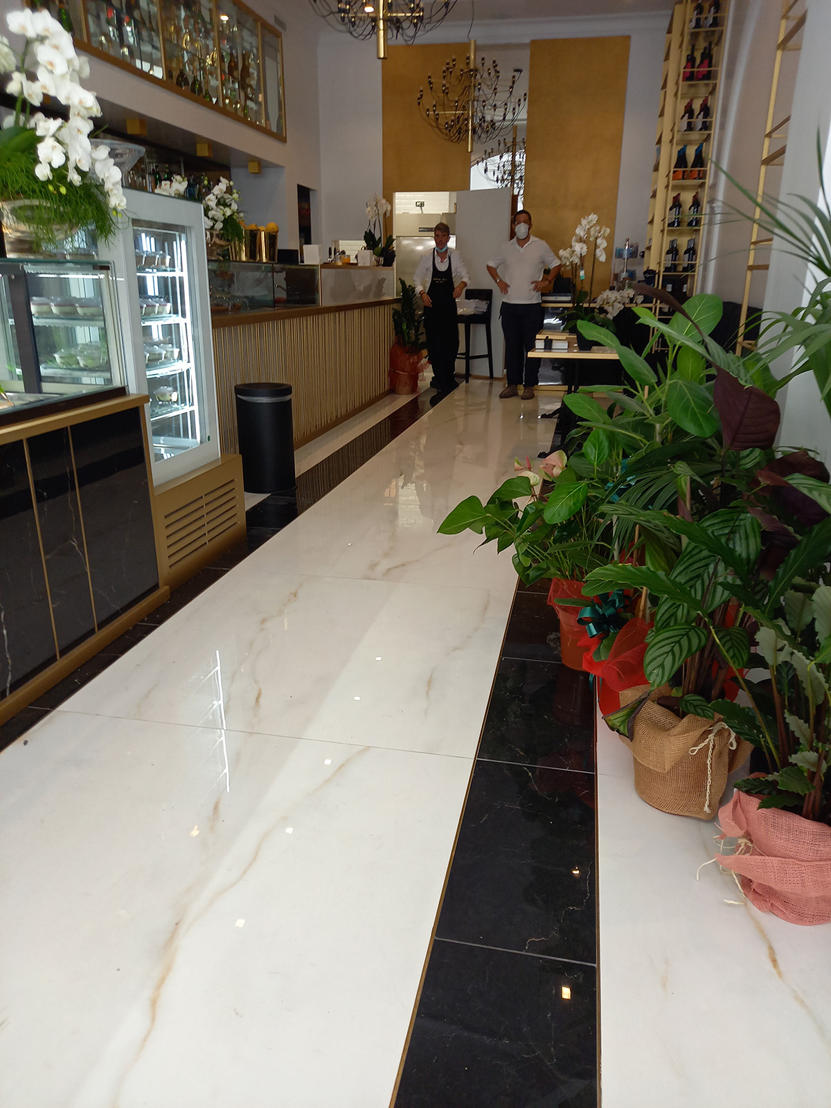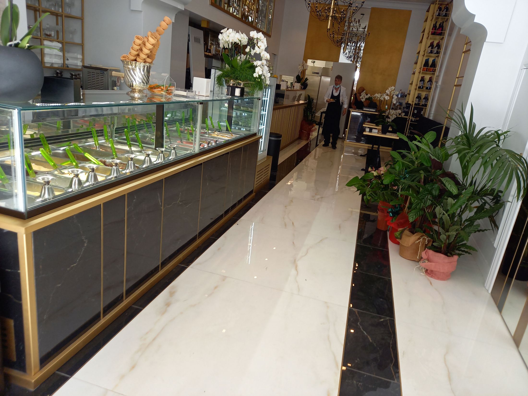 Un restyling di bar gelateria romano dove le vene dorate di Saint Laurent e Covelano di Golden Pure by Ricchetti spiccano e risplendono grazie alla finitura lux, una lappatura a specchio di estrema nitidezza e profondità. Il formato principale scelto è il 120x120, ma sono previsti anche il 30x60 ed altri formati tagliati ad hoc per ricreare effetti geometrici fini e glamour, intervallati da bacchette in metallo ottone.