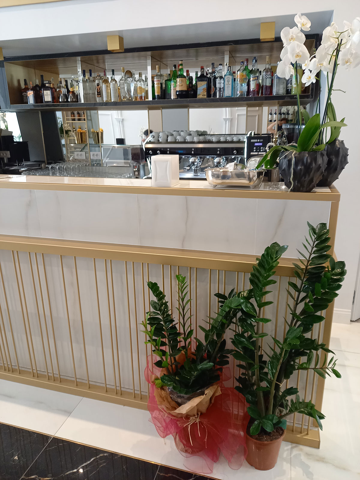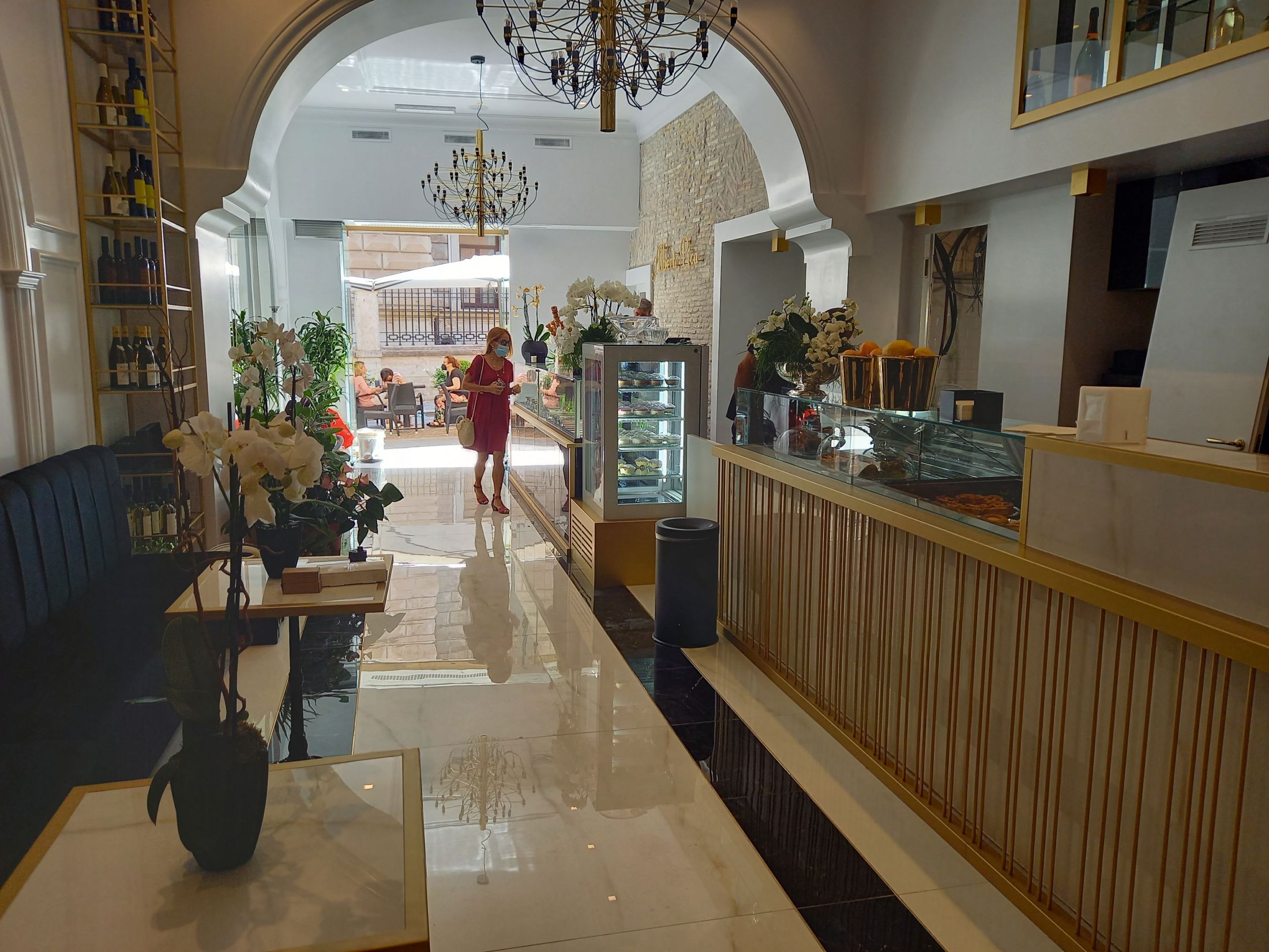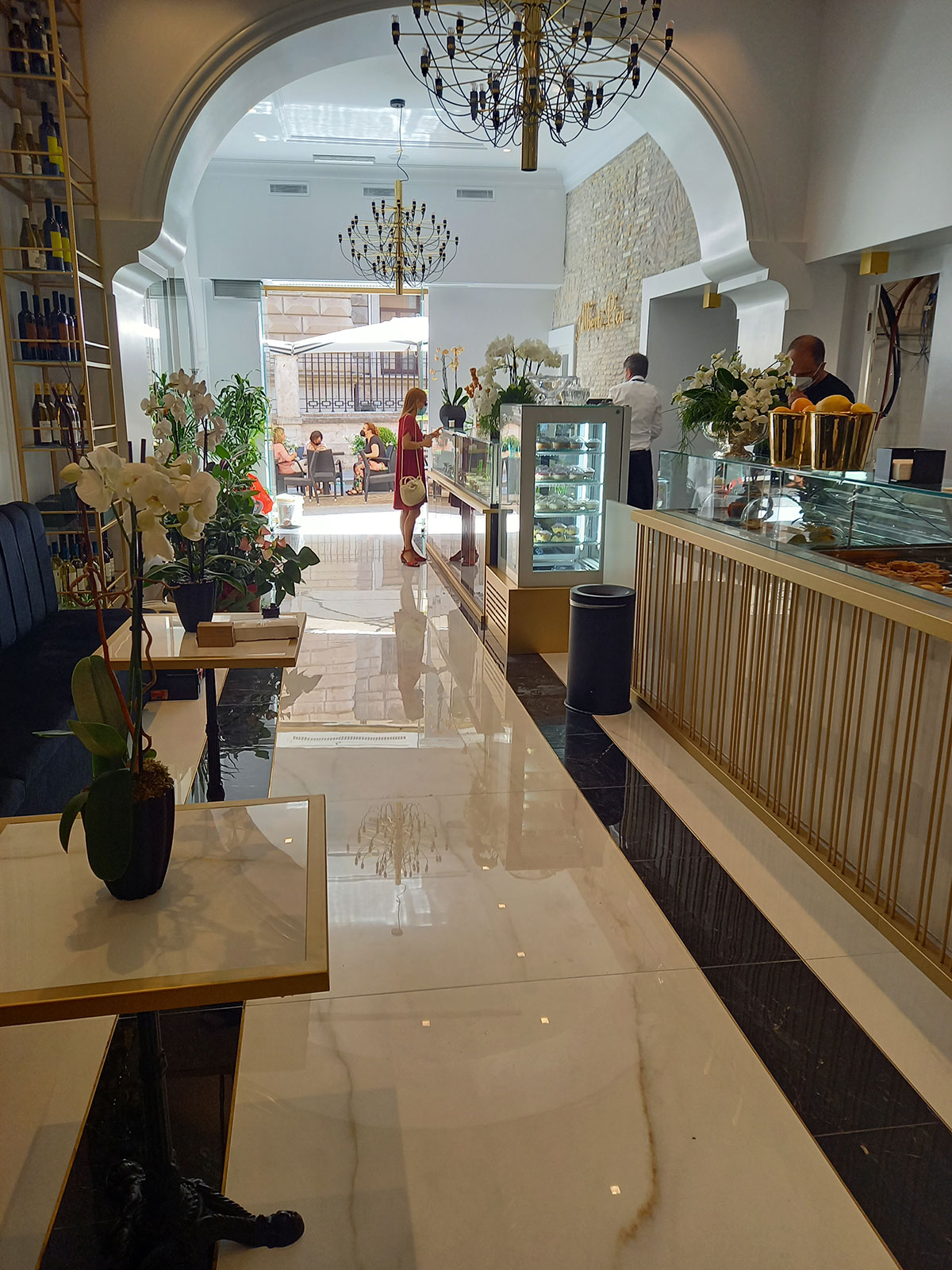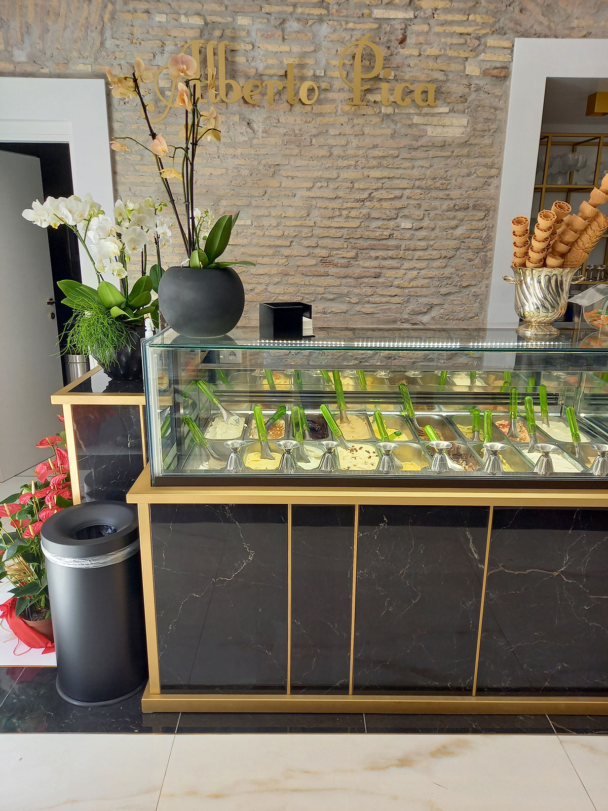 Un restyling di bar gelateria romano dove le vene dorate di Saint Laurent e Covelano di Golden Pure by Ricchetti spiccano e risplendono grazie alla finitura lux, una lappatura a specchio di estrema nitidezza e profondità. Il formato principale scelto è il 120x120, ma sono previsti anche il 30x60 ed altri formati tagliati ad hoc per ricreare effetti geometrici fini e glamour, intervallati da bacchette in metallo ottone.