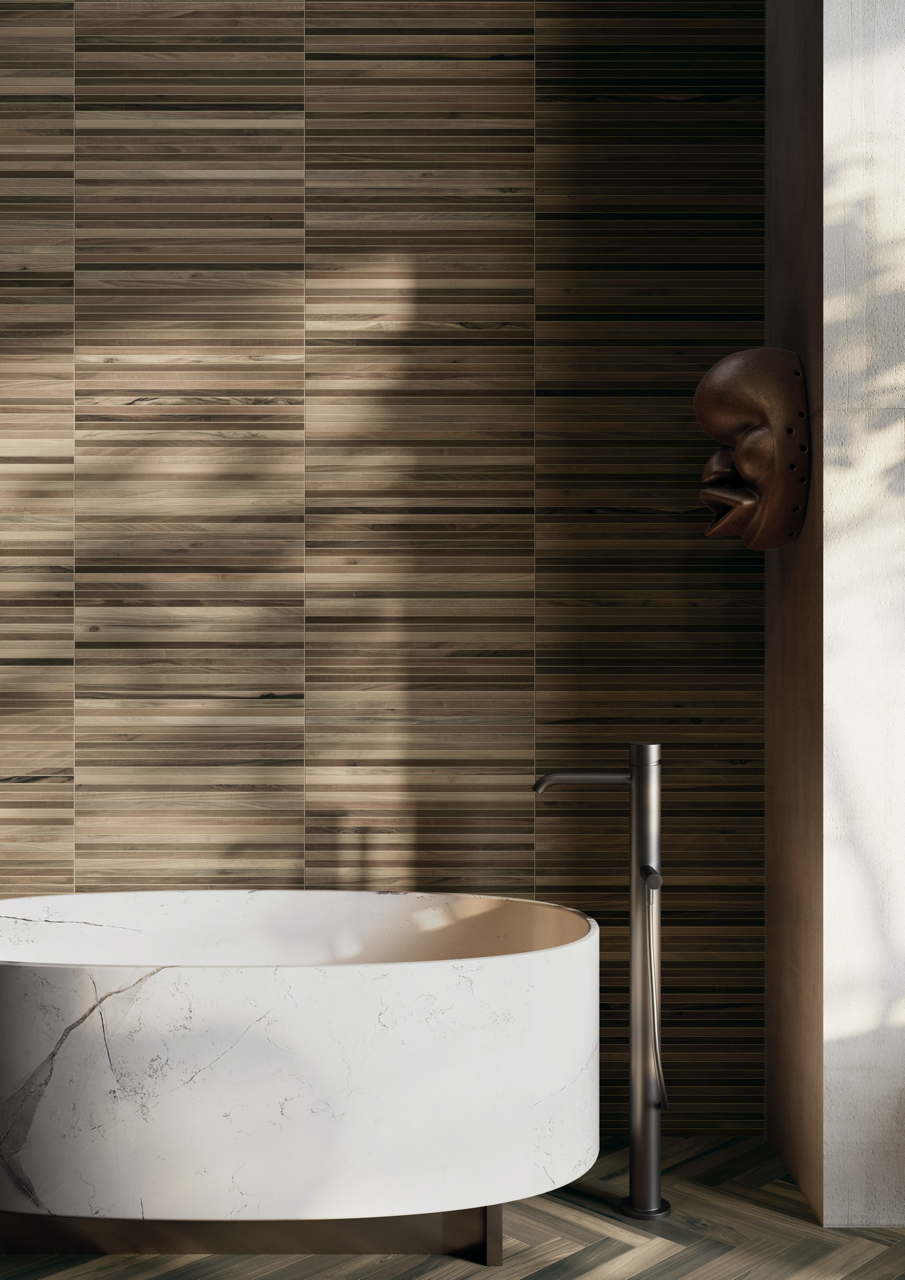Omaggio ceramico creativo all’essenza del noce americano. Naturalità e sperimentazione lavorano insieme per generare un materiale unico, perché semplice ma infinitamente vario, equilibrato ma visivamente così potente.